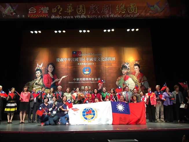 巡迴美國及加拿大共11個城市進行本(104)年國慶文化訪演活動之明華園歌仔戲團一行41人於本年9月24日下午搭機抵達美國德州休士頓市,當(24)日傍晚休士頓美南國際電視台直播專訪明華園歌仔戲團陳勝福總團長及孫翠鳳總監,並訪問率團之總統府吳英毅國策顧問、駐休士頓辦事處黃敏境處長及「休士頓全僑慶祝中華民國104年雙十國慶籌備會」黎淑瑛主任委員等共1小時。當晚黃處長夫婦並款宴歡迎明華園歌仔戲團一行,次(25)日中午休士頓越棉寮華裔聯誼會亦設宴款待全體團員。由於歌仔戲之閩南語與潮州話有許多雷同或共通之處,駐處並廣邀越棉寮傳統僑社人士觀賞當晚之明華園演出。 訪演節目於本年9月25日晚上7時於休士頓大學可容納1,600多人之表演廳卡倫堂(Cullen Performance Hall)演出鴛鴦槍及護國將軍二齣戲碼,出席觀眾爆滿,達1,600多人。節目首先由本年雙十國慶籌備會黎主委簡短致詞後,駐處黃處長接著以英文及中文向在場之華僑、老僑、台僑及主流社會賓客致詞表示,中華民國是中華傳統優良文化保存最完整的地方,馬總統致力推動中華民國在國際間扮演中華文化領航者的角色,包容與尊重台灣原住民、閩南、客家、大陸同胞及東南亞新移民等各族群之多元文化,這些都是構成具有台灣特色的中華文化重要元素,並在中華民國自由、民主制度下,成為推動國家進步的重要力量與支柱;此外,歌仔戲在台灣已有一百多年歷史,為發展成熟之具有台灣特色的中華文化表演藝術,明華園將歌仔戲發揚光大,其藝術能量展現台灣人強韌的生命力與創造力。黃處長並感謝來自台灣、大陸僑胞的熱情參與,以及休士頓越棉寮傳統僑社的大力支持及贊助,相信明華園歌仔戲演出將帶給觀眾親切的中華文化藝術饗宴。 黃處長致詞後,德州哈里斯郡(Harris County)張文華法官代表郡長Ed Emmett,鄭昭僑務諮詢委員代表休士頓市長Annise D. Parker分別頒贈祝賀文告(proclamation)。在演出兩齣戲碼之間,孫翠鳳總監邀請觀眾上台互動及體驗歌仔戲男女演員反串演出之難度,最後邀請黃處長夫婦等貴賓上台與全體演員及觀眾一齊高唱「梅花」歌曲,全場並揮舞中華民國國旗。節目前後歷時2小時30分結束,氣氛熱烈。