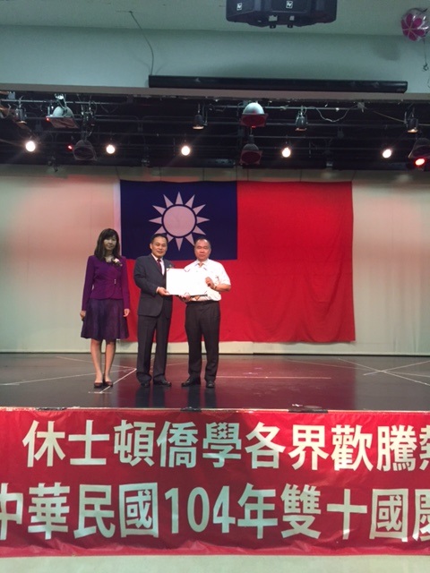 本處黃敏境處長夫婦偕本處同仁於本(104)年10月10日上午10時出席「休士頓地區慶祝中華民國104年國慶活動籌備會」在休士頓僑教中心戶外舉行之國慶升旗典禮及大禮堂舉行之國慶茶會。黃處長於升旗典禮及國慶茶會致詞,並代表馬總統頒贈抗戰勝利紀念章與證書予旅居休士頓之抗戰英雄以感謝渠等對中華民國之貢獻。