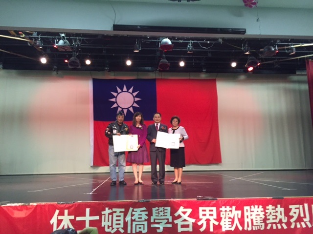 黃處長於致詞結束後,亦頒贈聘書予新任僑務委員甘幼蘋與新任僑務諮詢委員駱健明,並頒贈「捐贈僑生獎學金」感謝狀予王敦正僑務諮詢委員與王妍霞僑務促進委員以及「高雄氣爆捐款」感謝函予前台商會會長方台生。黃處長並一一頒贈中華民國抗戰勝利紀念章與證書予休士頓地區7名對日抗戰英雄,以表揚渠等對抗戰之貢獻。因體諒抗戰老英雄年邁不良於行,上台不便,黃處長特別移至台下頒贈紀念章與證書予7位老兵,一一宣讀紀念章證書內容,並與抗戰老英雄們分別及團體合照。