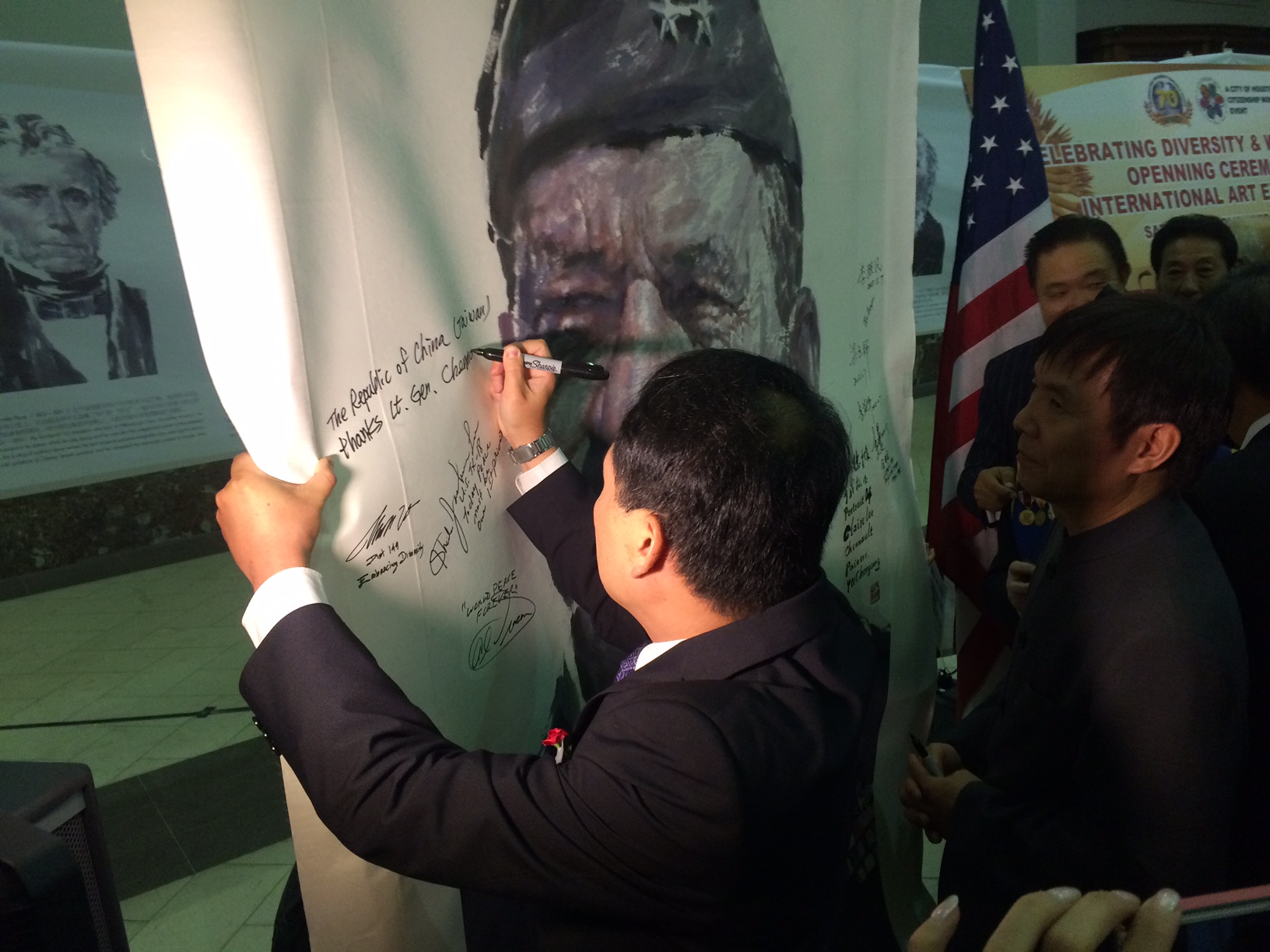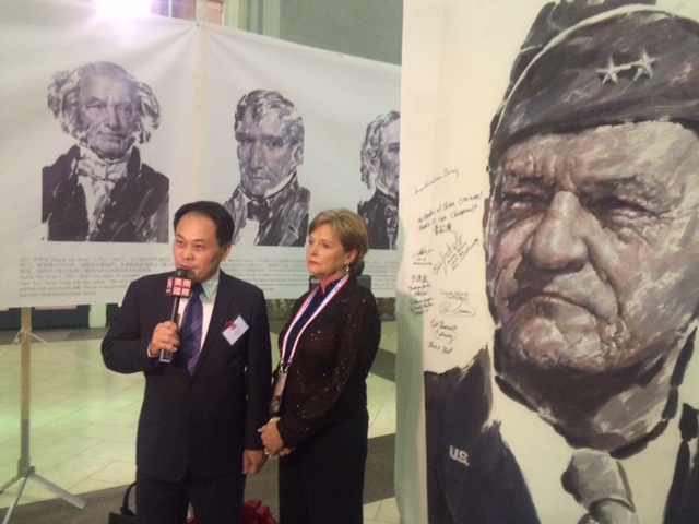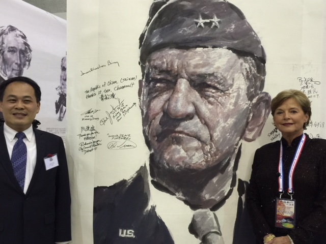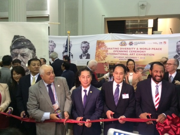 駐休士頓辦事處黃敏境處長於2015年11月7日下午偕齊永強副處長、僑教中心莊雅淑主任、李美姿副主任及各組組長與同仁參加美南報業電視傳媒集團在休士頓Minute Maid Park棒球場舉辦之紀念第二次世界大戰勝利70週年國際畫展,美國聯邦眾議員Al Green、Sheila Jackson Lee丶德州州眾議員武休伯(Hubert Vo)、休士頓市議員阮進盛(Richard Ngyuen)、飛虎隊陳納德將軍之外孫女暨「陳納德航空及軍事博物館」館長嘉蘭惠(Nell Calloway)、參與二戰老兵以及上百位我僑界領袖亦出席該活動。黃處長於畫展現場與嘉蘭惠女士在畫展主要陳列之陳納德巨幅畫像前合影並共同接受美南電視訪問,黃處長並在陳納德畫像上簽名寫下「中華民國(台灣)感謝陳納德將軍(The Republic of China (Taiwan) thanks Lt Gen Chennault)」,代表政府感謝陳納德將軍協助中華民國打贏抗日戰爭之貢獻,嘉蘭惠女士甚表感動並感謝中華民國政府對其外祖父之肯定。黃處長並在畫展開幕儀式中應美南新聞集團之邀請為二戰英雄頒發二戰紀念章,感謝他們為世界和平所付出之貢獻,並應邀與聯邦眾議員Al Green、Sheila Jackson Lee丶州眾議員武休伯(Hubert Vo)、市議員阮進盛(Richard Ngyuen)等共同為活動剪綵,有效彰顯中華民國對日抗戰史實之話語權、對第二次世界大戰之貢獻以及與美國之同盟國關係。黃處長及同仁隨後並受邀在貴賓席與數百位我國僑胞及中華民國抗戰老兵共同觀賞紀念二戰大型文藝晚會。晚會主辦單位安排各國不同族裔代表表演,我僑胞The G'oldies合唱團亦於晚會中穿著臺灣原住民服飾,搭配臺灣風景影片,演唱外婆的澎湖灣等膾炙人口的民歌,該晚會吸引上萬人前往觀賞。