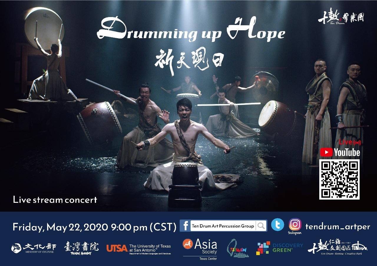 值此新冠病毒肆虐全球,人心及健康受到史無前例衝擊,文化部偕同駐休士頓台北經濟文化辦事處與當地藝文機構:亞洲協會德州中心(Asia Society Texas Center)及Discovery Green,於美國中部時間5月22日晚間9時,以網路直播方式呈現台灣十鼓擊樂團75分鐘作品《祈天現日》,向全世界第一線抗疫醫療人員表達敬意與謝意。