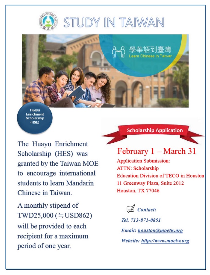 為加強與世界各國學術交流,並培養具發展潛力且通曉我國語文文化之外國人士,教育部特設置華語文獎學金,提供外國人士赴臺修讀華語文,藉此增進與世界各國之交流、瞭解及友誼。凡美南地區(德州、路易斯安那州、密西西比州、阿肯色州、奧克拉荷馬州等)美國學生擬赴臺研習華語文者,請上網http://www.moetw.org/2021/01/2021_7.html下載相關資訊或洽駐休士頓辦事處教育組:電郵 houston@moetw.org ;電話713-871-0851。