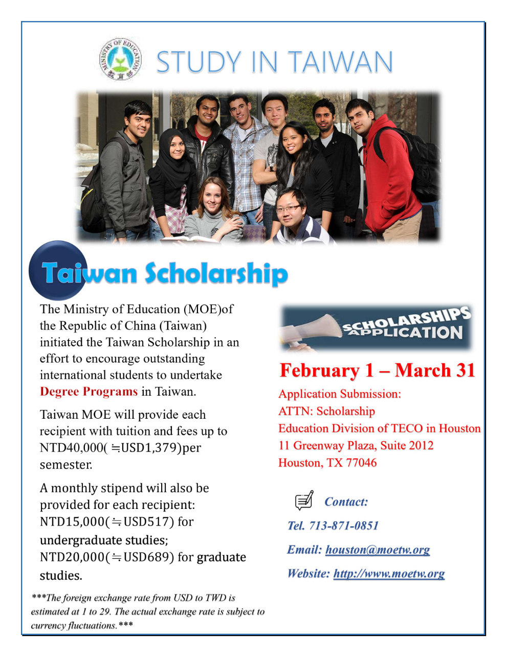 The Taiwan Scholarship is provided by Taiwan’s Ministry of Education to encourage American students from Arkansas, Louisiana, Mississippi, Oklahoma, and Texas to undertake degree programs in the Republic of China (Taiwan).