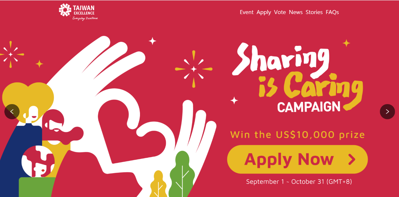 "Sharing is Caring, Taiwan Excellence" is the first global charity initiative organized by TAITRA, under the auspices of the Ministry of Economic Affairs. The main themes of this event will be "Social Concern" and "Environmental Protection" together with Environmental, Social, and Corporate Governance (ESG). The goal is to invite global citizens to come up with creative initiatives, propose innovative solutions, integrate Taiwan Excellence products and services, and implement them in home countries to specifically aid the local environment and society. This will further demonstrate how much importance Taiwanese government and enterprises have attached to environmental sustainability and social responsibility, as well as showcasing their proactive attitude of engagement.