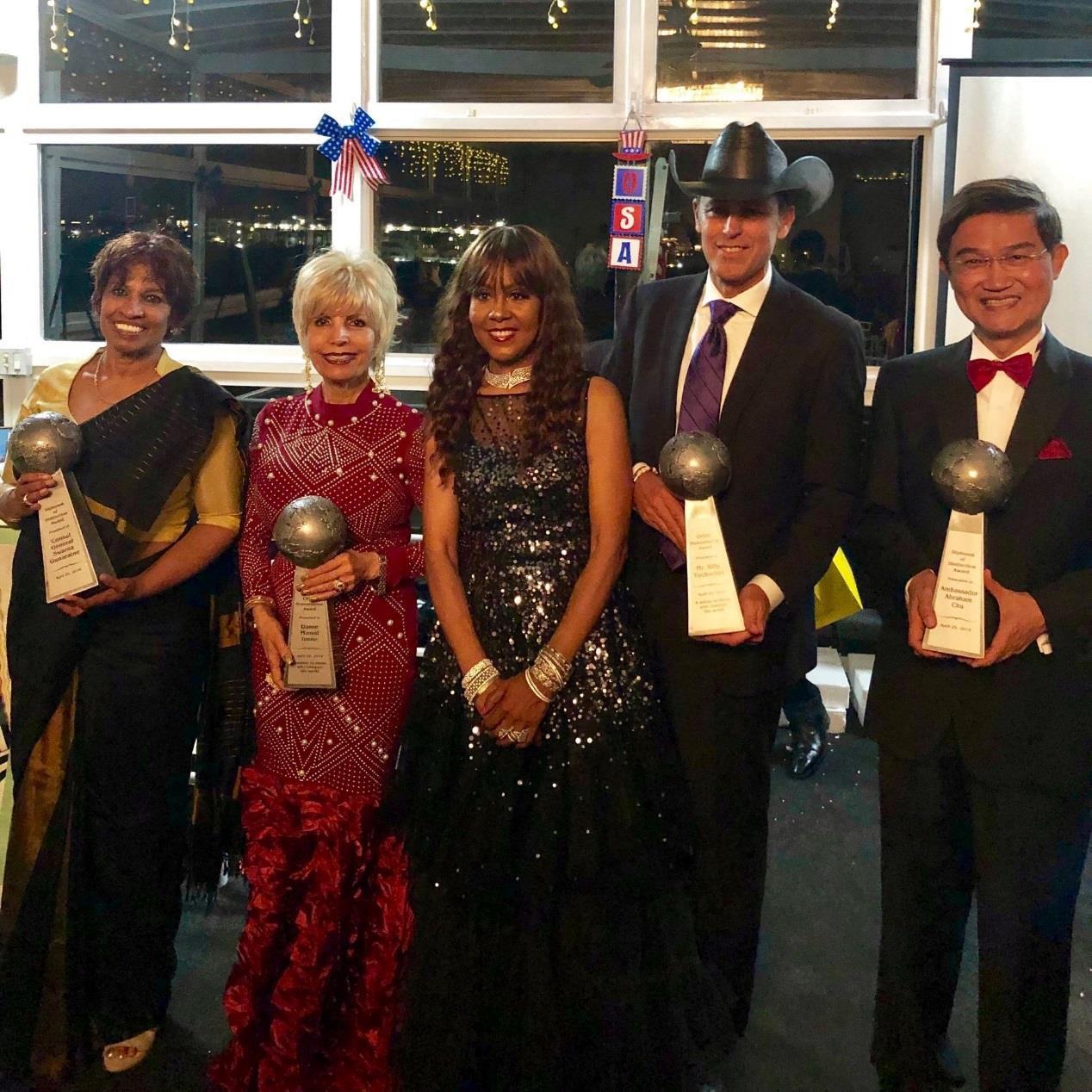 由左而右依序為斯里蘭卡駐洛杉磯總領事Swarna Gunaratne女士、人道主義者獎得主印度裔Dame Munni Irone女士、晚會發起人April Sutton、人道主義者獎得主美國慈善企業家Billy Tuchscher及本處朱處長文祥
