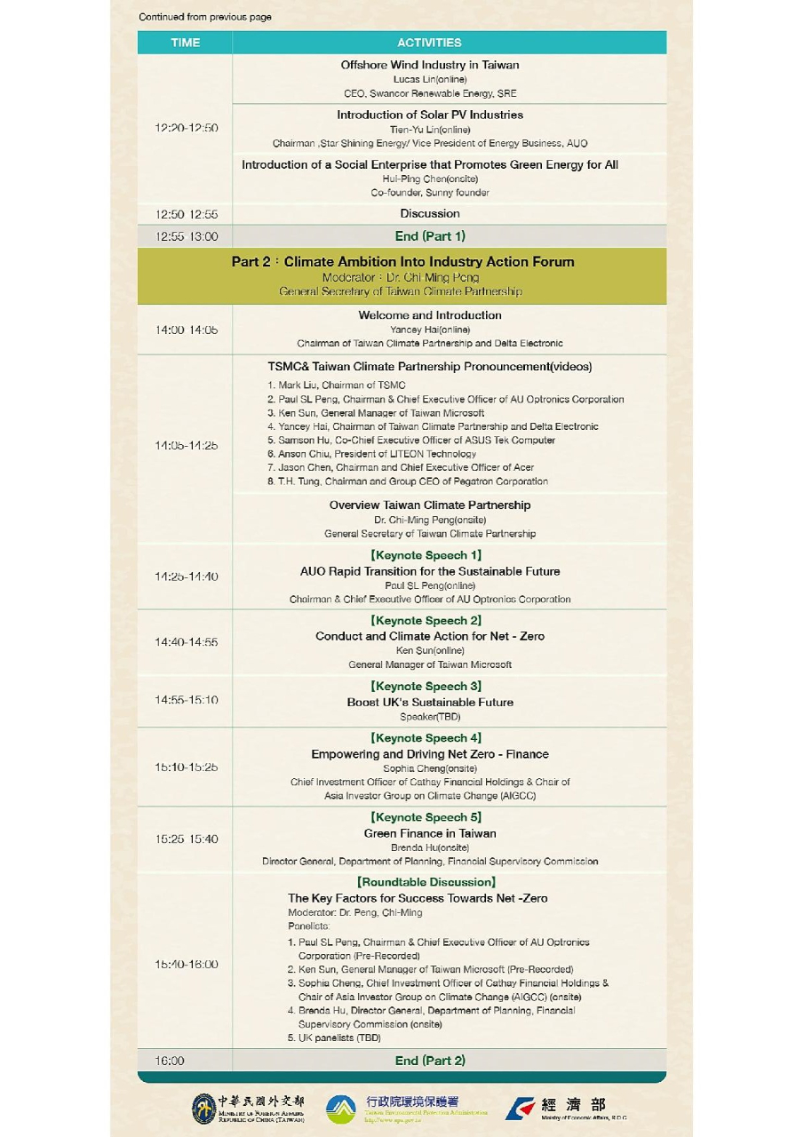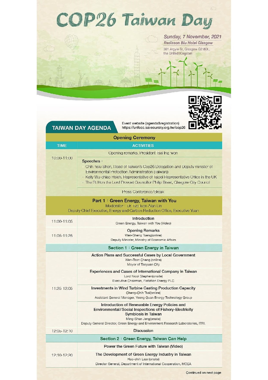為因應本年COP26的重要性及國際關注度,中華民國代表團將於大會舉行期間的11月7日(星期日,當地時間10:00~16:00)在格拉斯哥市的Radisson Blu Hotel以實體搭配線上形式辦理「台灣日」。上午場的主題為「台灣綠能發展」,下午場的主題為「企業氣候行動論壇」,歡迎大家踴躍至線上報名參加,網址:https://unfccc.saveoursky.org.tw/cop26。