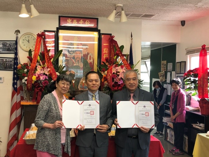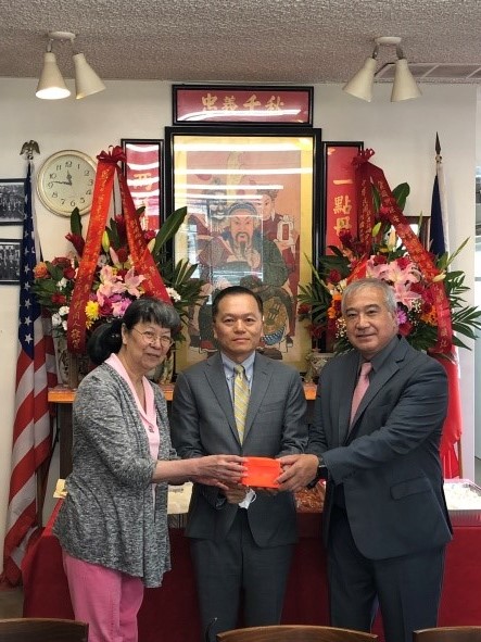 2021年12月4日林暉程副處長(中)代表僑務委員會童振源委員長頒發羅省岡州保安堂新任劉國賜主席(右)、潘杏萍副主席(左)賀狀