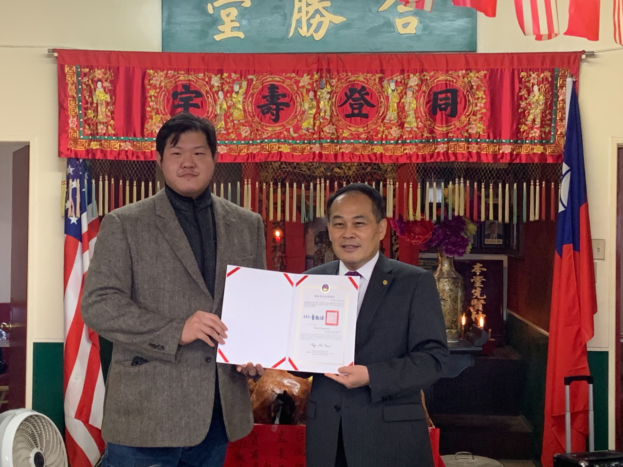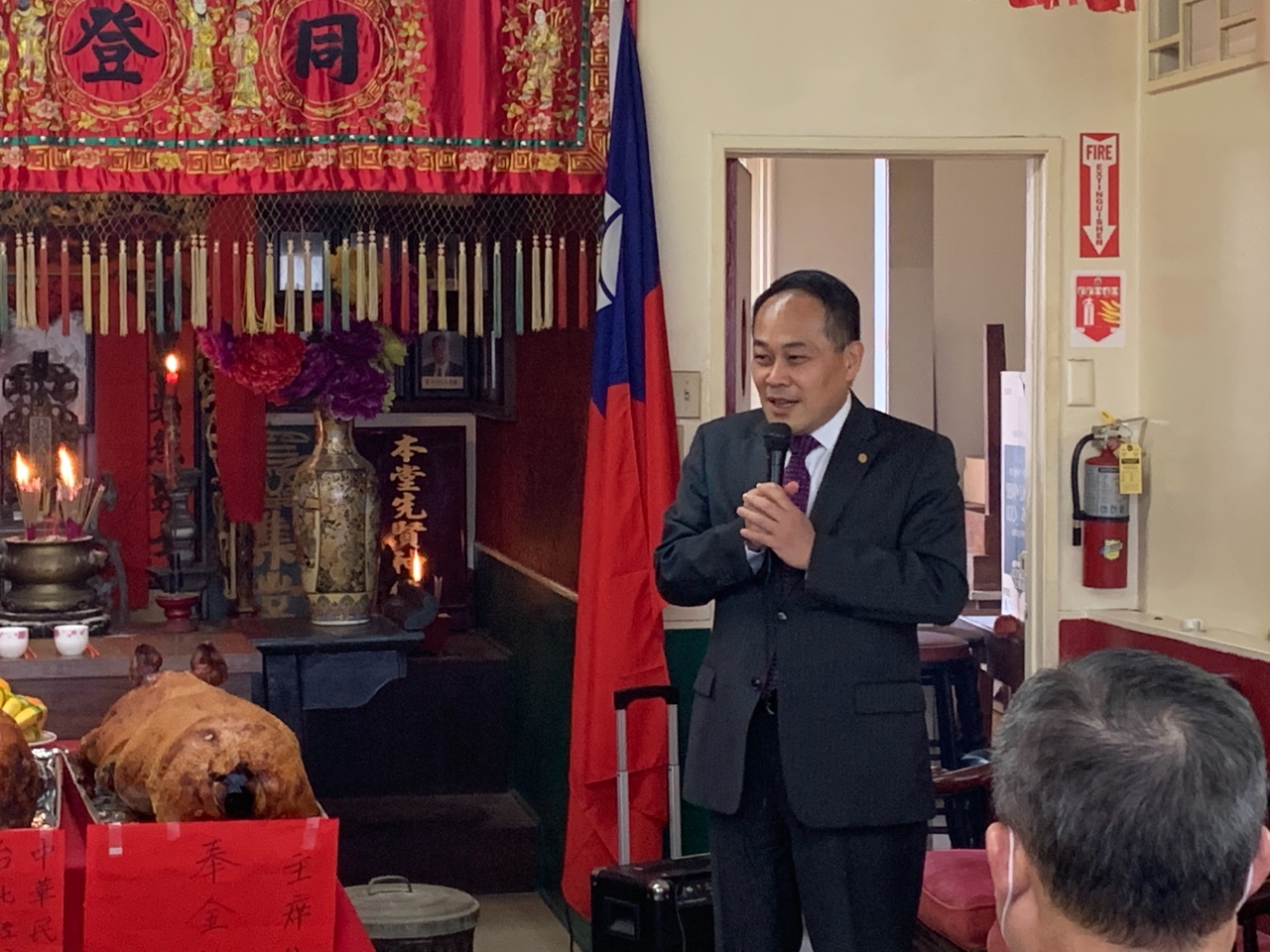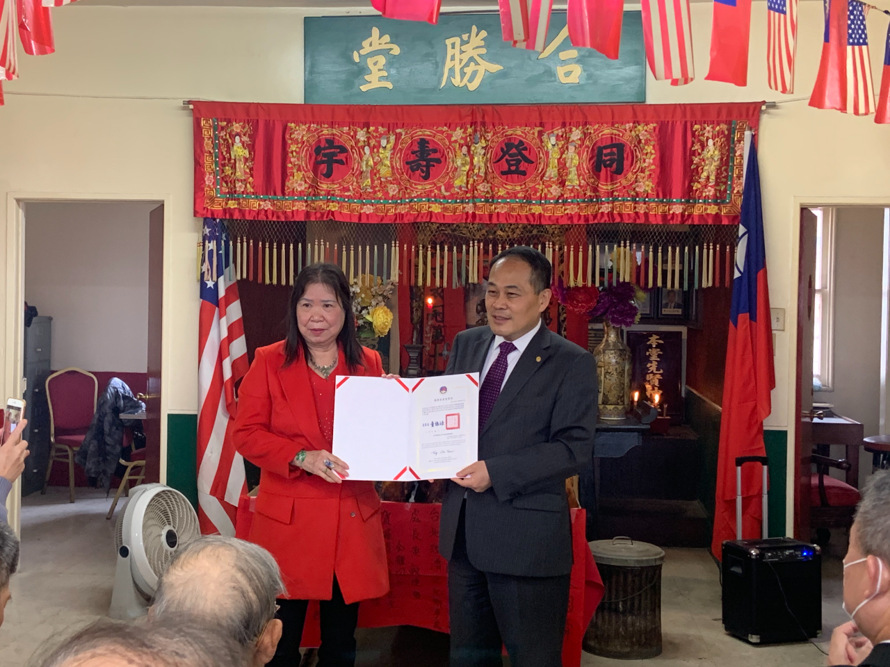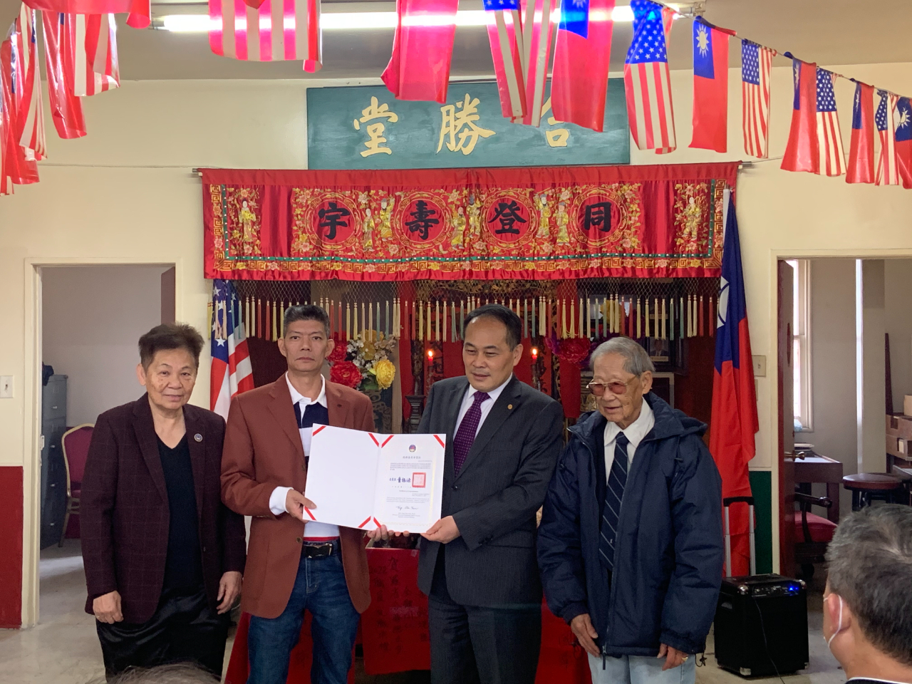 羅省合勝總支堂於本(2021)年12月29日中午舉行2022年新任職員交接典禮,朱國舜及高愛英分別新任該堂主席、副主席。活動儀式開始由滿任黃美霞主席偕新任主席、副主席、該公所黃祖蔭元老、羅省中華會館廖美華主席、鄺松齡候任主席向關聖帝君上香及敬酒,案上擺放三隻金豬及三牲、糕點及祝賀花籃。接續由駐洛杉磯台北經濟文化辦事處黃敏境處長擔任主席印信監交人,並帶領全體職員宣讀誓詞。陪同前往的還有經文處葉立傑組長及洛僑中心陳敏永主任與鄭心茹副主任。 黃處長致詞時提及,有句話說台灣最美的風景是人,而華埠最美的風景就是中山廣場,廣場旁古色古香的羅省合勝總支堂大樓建築上豎立中華民國國旗的畫面,所代表的意義不僅是中華民國國旗與廣場上國父孫中山先生銅像同框,更彰顯孫中山先生創建的是實施自由民主制度的中華民國,而非其他國家。羅省合勝總支堂長年擁護中華民國,對於孫中山先生創建中華民國功不可沒,謹代表中華民國政府對合勝堂昆仲、元老們致上最高敬意。 黃處長提醒與會者,在疫情升溫的此時,務必配戴口罩、施打疫苗,以維護自己、家人與朋友的健康,並繼續貢獻僑社及支持羅省中華會館、支持中華民國台灣。黃處長也代表僑務委員會童振源委員長致頒賀狀予朱國舜主席、高愛英副主席,及致頒感謝狀予滿任黃美霞主席、梁國輝副主席,以資肯定及鼓勵。 本次活動出席人員尚包括羅省中華會館四大首長及候任胡卓球副監事長;方杰洲、黃鍾艷珍顧問;各公所代表及該堂昆仲共約60人。