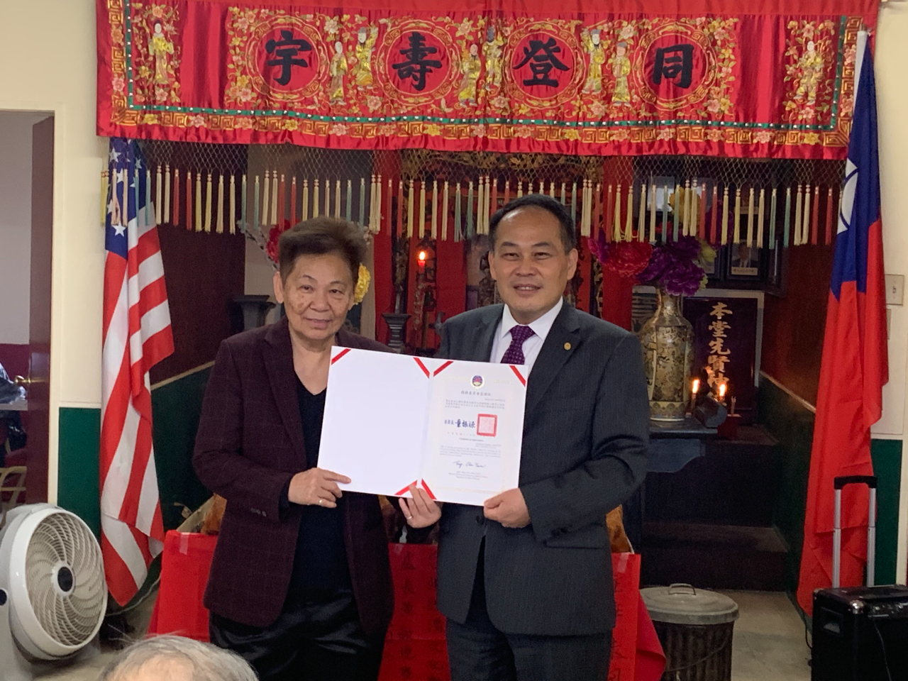 2021年12月29日黃敏境處長代表僑務委員會童振源委員長致頒賀狀予新任高愛英副主席