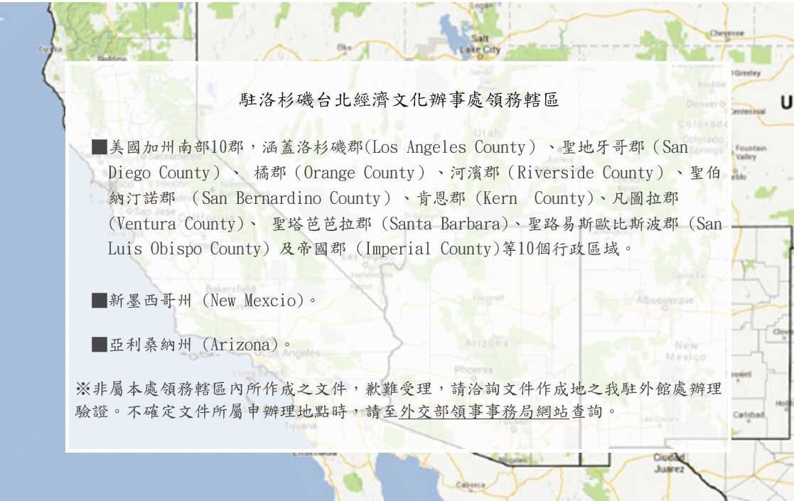本處文件證明領務轄區 - 駐洛杉磯台北經濟文化辦事處 Taipei Economic and Cultural Office in Los Angeles ::: 跳到主要內容區塊