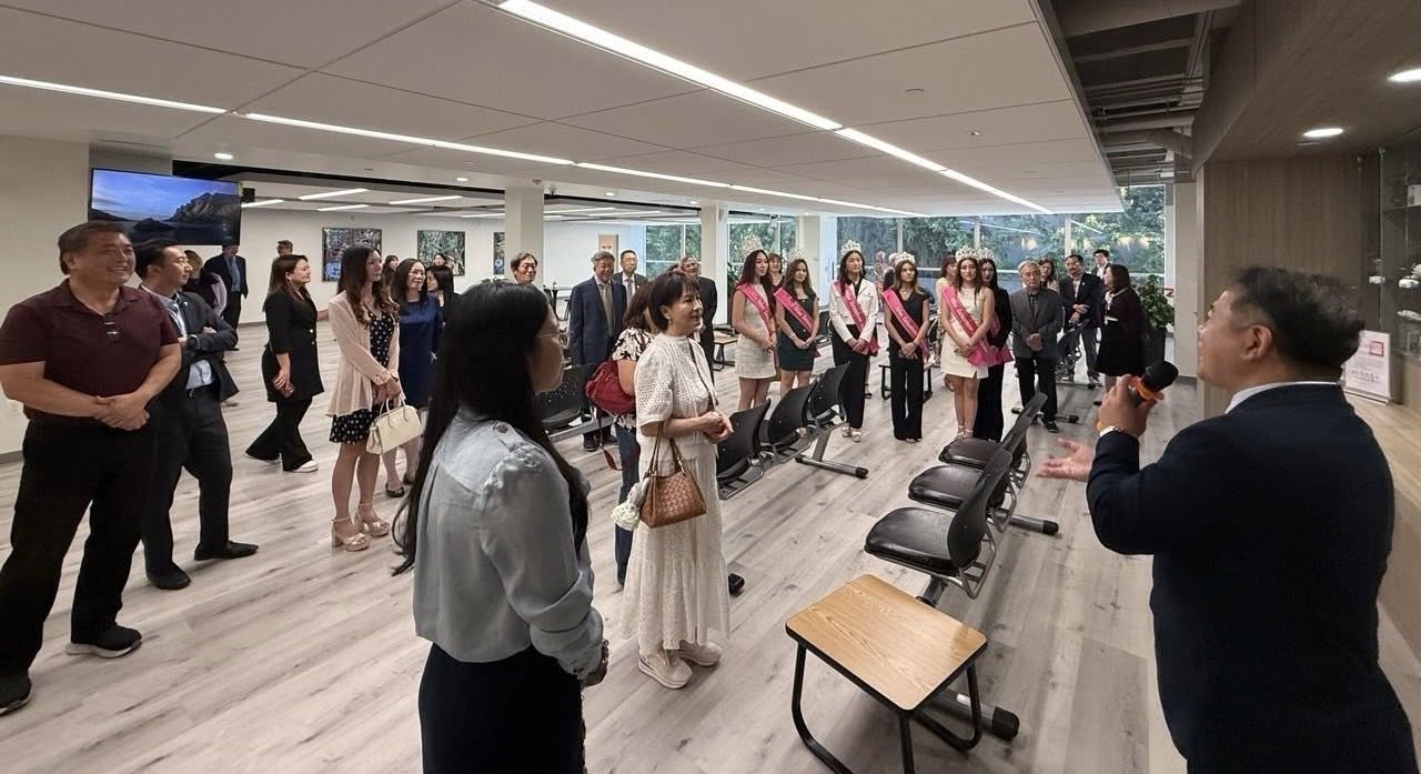 紀欽耀處長偕同仁於8月8日在本處接待大洛杉磯台灣會館田詒鴻董事長、會館董事及2025年台美小姐一行35人,除了帶領來賓參觀領務大廳及藝術展品,並就海外出生子女申請我國護照及返台設籍等議題進行交流與討論。