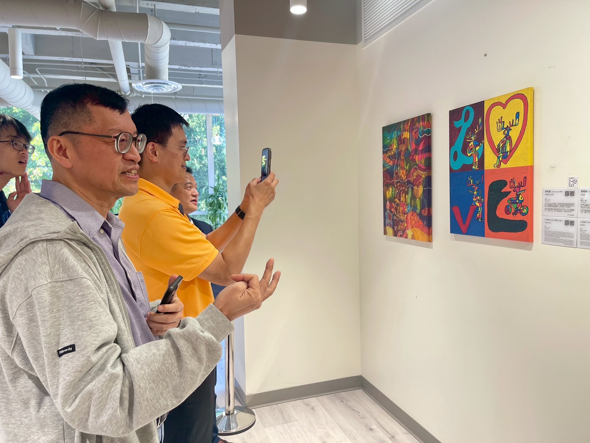 圖說2:柯立偉教授透過手機AR觀賞本處2樓台灣畫家李柏毅的虛擬互動畫作。