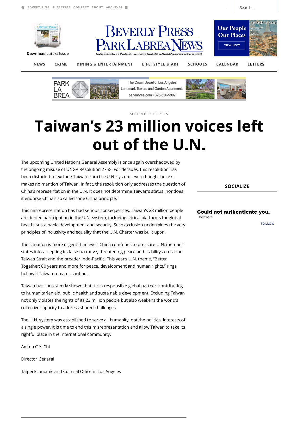 第80屆聯合國大會目前在美國紐約召開,駐洛杉磯台北經濟文化辦事處紀欽耀處長投書美國南加州「比佛利報」 (Beverly Press),該報於9月11日刊登本處紀欽耀處長投書,呼籲支持台灣參與聯合國。