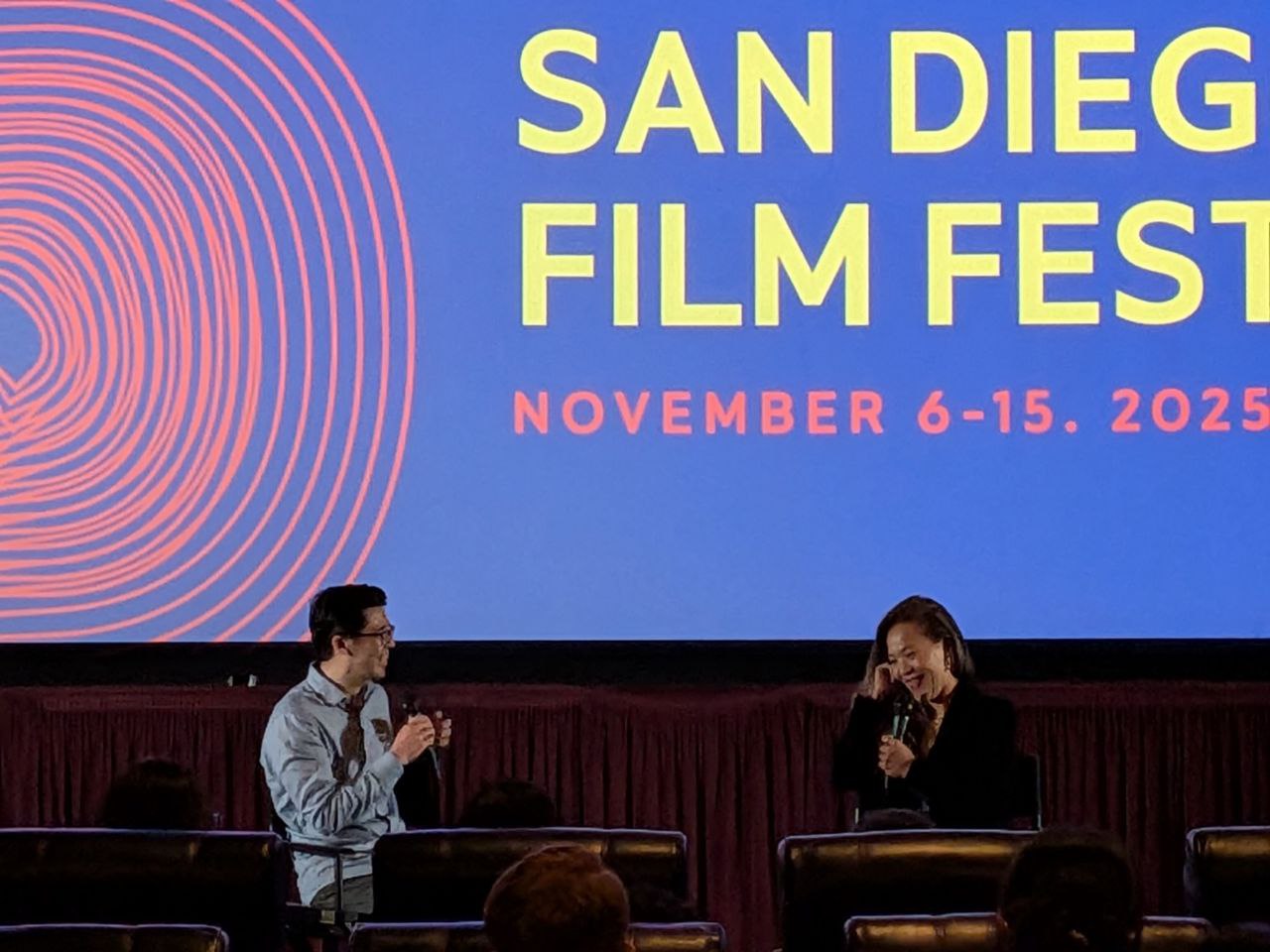 圖說2:《左撇子女孩》鄒時擎導演(右)與聖地牙哥亞洲電影節總策展人Brian Hu進行映後座談,放映座無虛席。