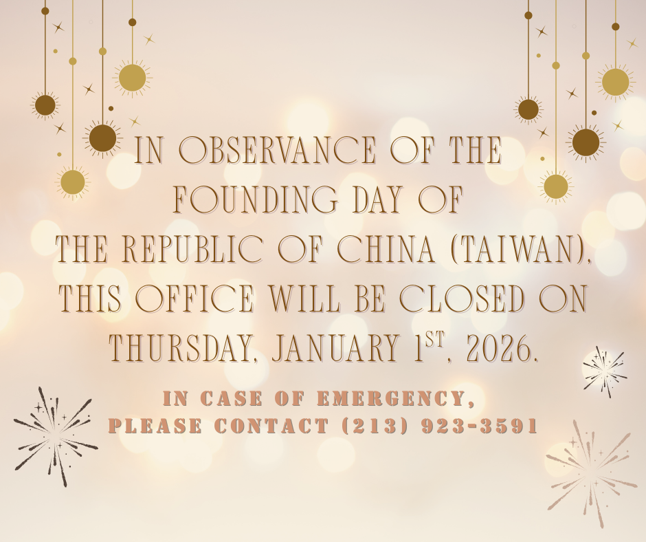 2026年1月1日(星期四)為中華民國開國紀念日,本處公休一天,特此公告。 本處緊急聯絡電話:(213)923-3591