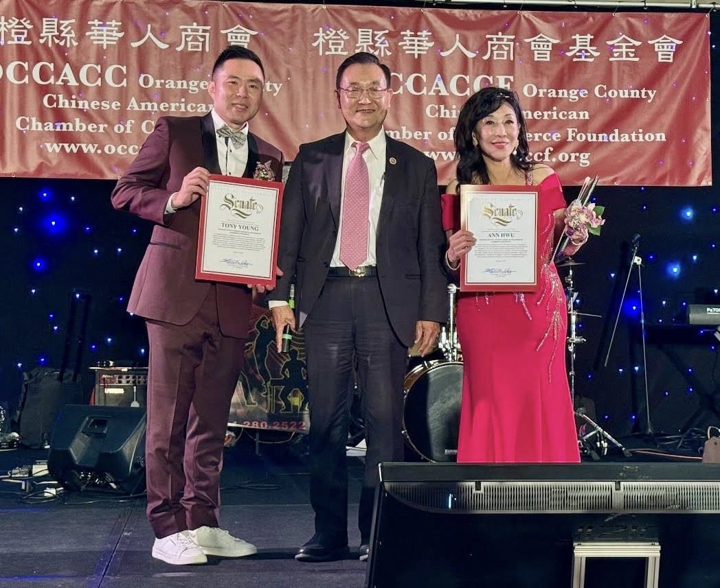 圖說3:聯邦眾議員劉雲平(右)偕母親劉丘繼聰(中)出席橙縣華人商會年會,並讚揚滿任會長胡安瀅(左)領導有方。