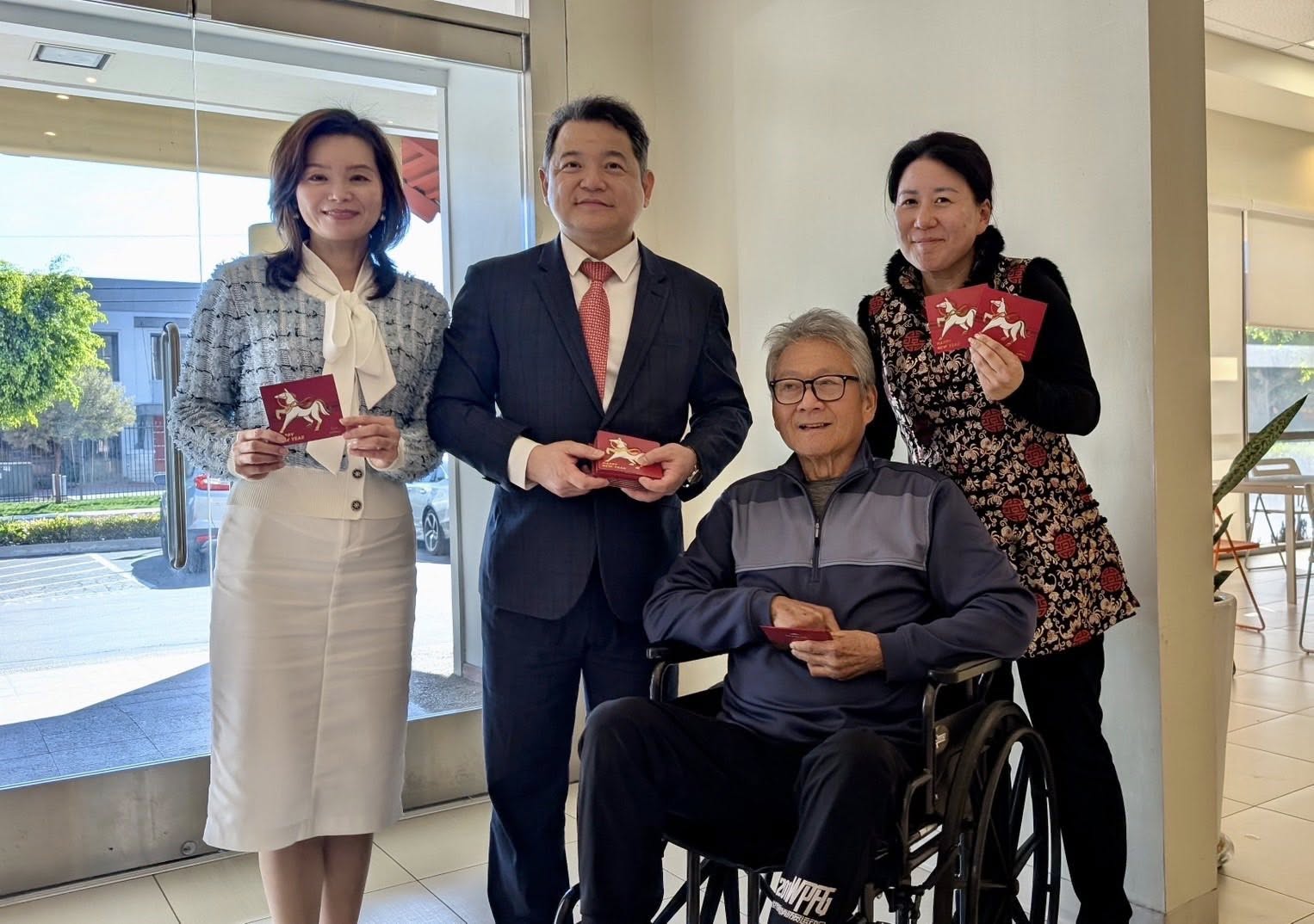 紀欽耀處長夫婦偕同仁於2月22日上午出席在洛僑中心舉行的新春聯合團拜,現場發送總統府馬年福袋及「七喜春來」春聯,祝福僑民們龍馬精神、萬事如意!當天包含聯邦眾議員趙美心(Judy Chu)、加州州眾議員方樹強(Mike Fong)、總統府國策顧問林榮松、行政院政務顧問陳玲華、吳兆峯及羅省中華會館聶澤英主席等眾多貴賓、社區領袖及僑胞踴躍參與,共賀新歲!
