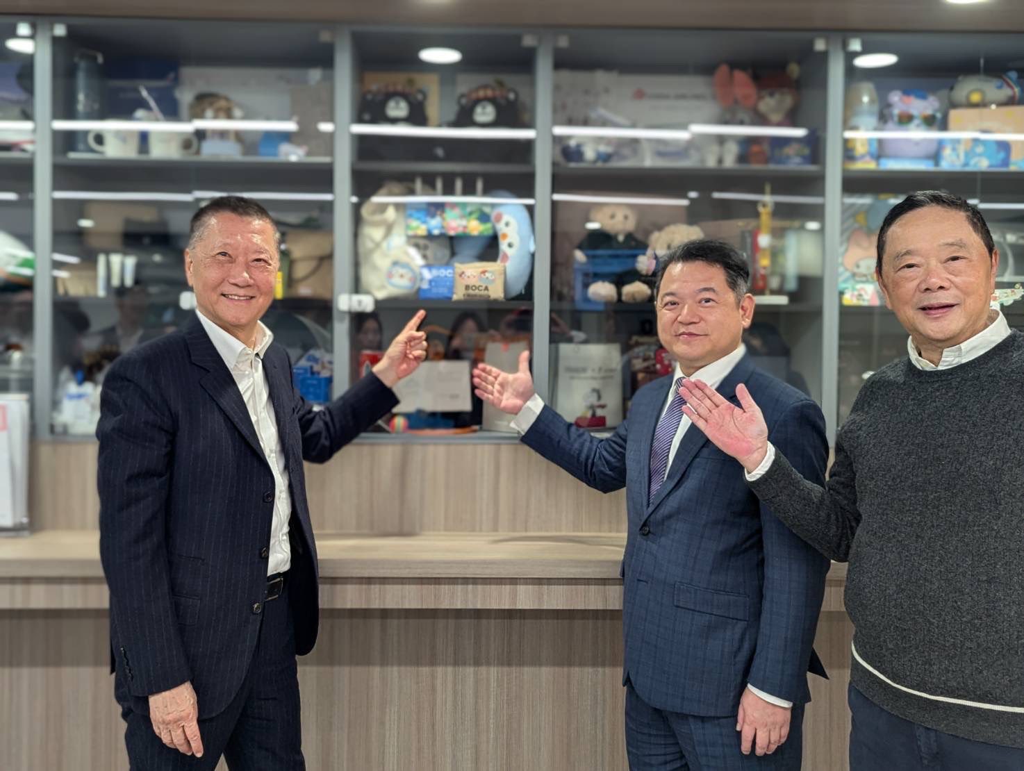 圖說3:紀欽耀處長向訪賓介紹領務大廳櫥窗展示,並與雄獅旅遊集團王文傑董事長(左)及雄獅旅遊北美公司劉文義總經理(右)合影留念。