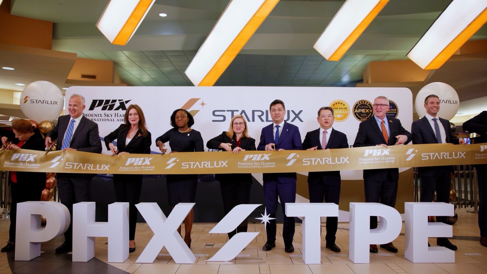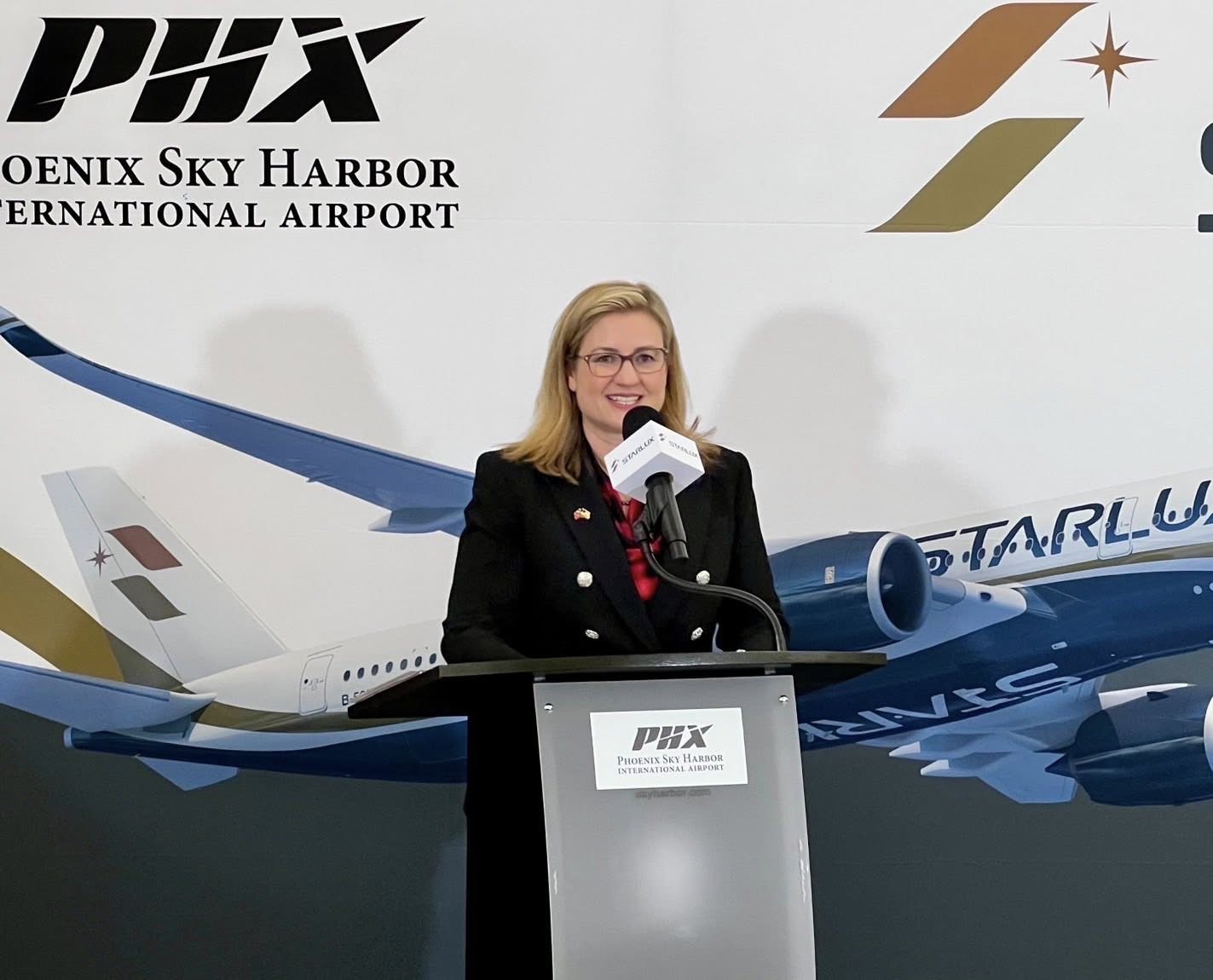 Director General Amino Chi was delighted to join Phoenix Mayor Kate Gallego and STARLUX Airlines CEO Glenn Chai in celebrating Starlux Airlines’ Taipei–Phoenix inaugural flight ceremony at Phoenix Sky Harbor International Airport on January 15, 2026.