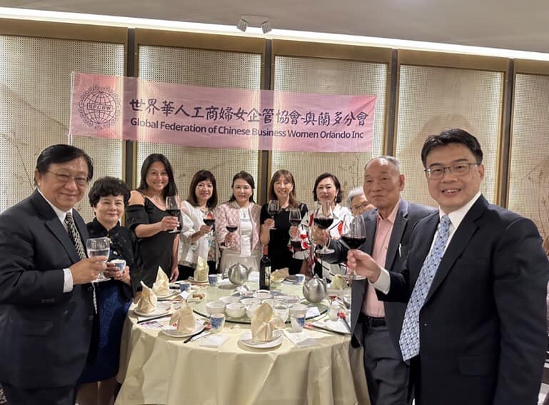 「世界華人工商婦女企管協會」佛州奧蘭多分會於5月14日正式成立。周處長先於5月13日晚上設宴歡迎該協會莊住維總會長與團隊前來中佛州出席奧蘭多分會成立大會,另也恭賀黃百齡董事長榮任該分會的創會會長。