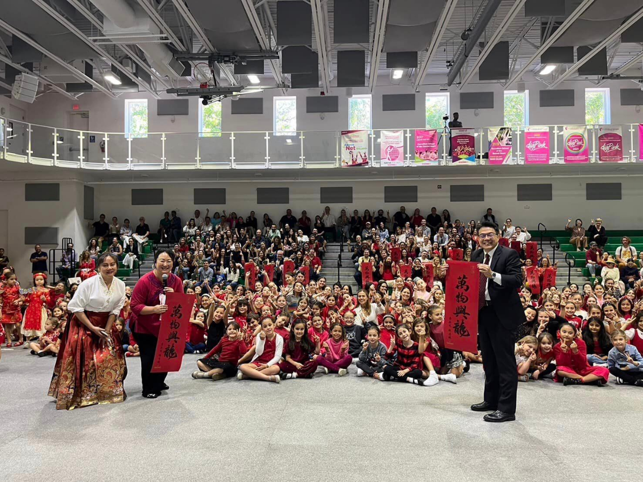 周處長2月16日偕僑務秘書黃士聰出席邁阿密地區最富盛名的天主教聖心女子學校(Carrollton School of the Sacred Heart)舉辦之農曆新年慶祝活動。該校校長Heather Gillingham及副校長Patrick Coyle、小學分部校長Brittney Hernandez及副校長Christie Diaz、台裔華語教師張曉蕾及學生與家長逾400人齊聚一堂歡慶龍年春節。