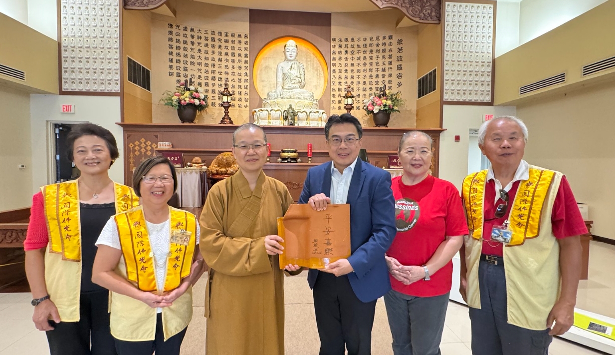 周處長於2/5上午走訪奧蘭多光明寺,在新春佳節之際,除致送僑委會馬年燈籠外,也親自向如元法師、各位師父、以及長年護持道場的師兄師姐們獻上誠摯的新年祝福與問候,現場洋溢著溫暖祥和的節慶氣氛。 如元法師特別分享光明寺屋瓦重修過程中所面臨的各項挑戰,過程雖不簡單,卻也展現出對文化傳承與信仰空間的用心與堅持。大家都相信,在眾人齊心努力下,光明寺很快就能完成修繕,再度展現台灣匠心獨具、細緻典雅的屋頂裝飾藝術。 此外,也期待在2/22「金龍大遊行」熱鬧落幕後,能與中佛州的鄉親們齊聚光明寺,一同參加年節親子走春活動,在祝福與歡笑中迎接新的一年。