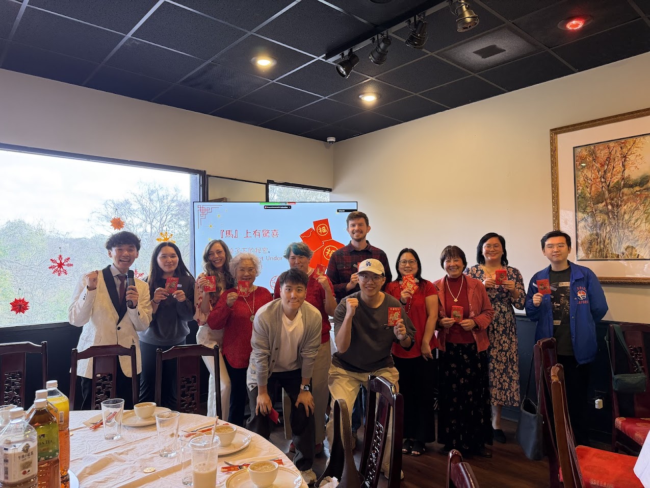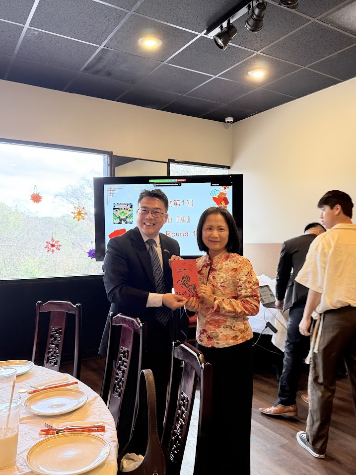 周處長應邀出席佛州甘城臺灣鄉親會及佛羅里達大學臺灣學生會攜手舉辦的「馬上有錢新春午宴」,與逾120位僑胞、師長與學生齊聚一堂,共度農曆新年。