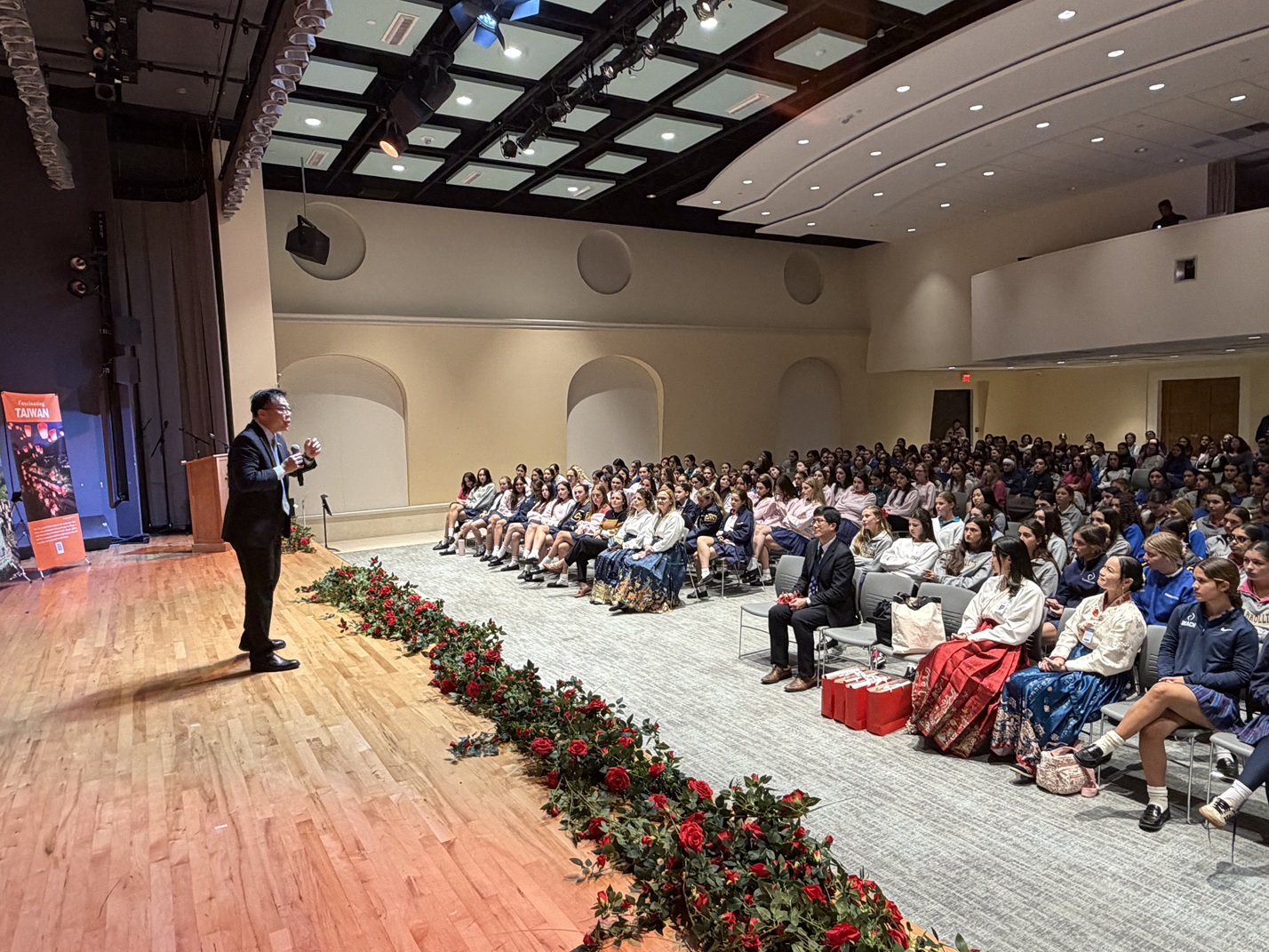 2月25日上午,周處長應邀參加 Carrollton School of the Sacred Heart 中文班舉辦的農曆新年活動。現場超過400位7至12年級師生熱情參與,總校長 Heather Gillingham-Rivas、中學部校長 Paola Consuegra 以及中學部副校長 Dr. Michelle Larrea 也一同出席,現場氣氛溫馨熱烈。