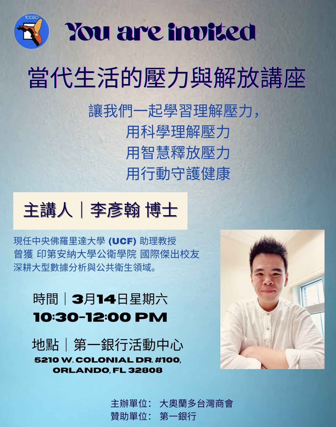 周處長3/14上午應邀參加大奧蘭多臺灣商會舉辦的「當代生活壓力與釋放座談」。 周處長特別謝謝李麗玲會長的費心安排 ,也期待李彥翰教授的講座讓我們更加認識壓力,並找到身心調適的最好方法,讓壓力轉化成生活中的正能量。 祝福台灣鄉親們「過得自在、活出精彩」!