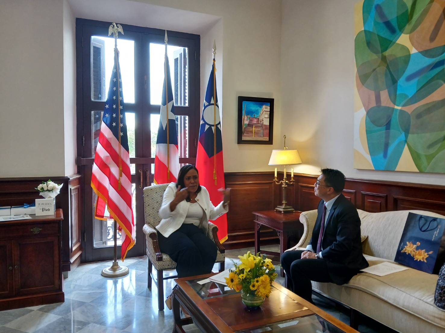 周處長日前前往波多黎各拜會邦務卿 Rosachely Rivera,就台波經貿交流議題進行討論。 邦務卿辦公室特別懸掛我國國旗??以示歡迎,表達雙方友好與尊重。 周處長與Rivera邦務卿對未來持續推動台波長期夥伴關係充滿信心,期望創造互利共贏的合作成果。