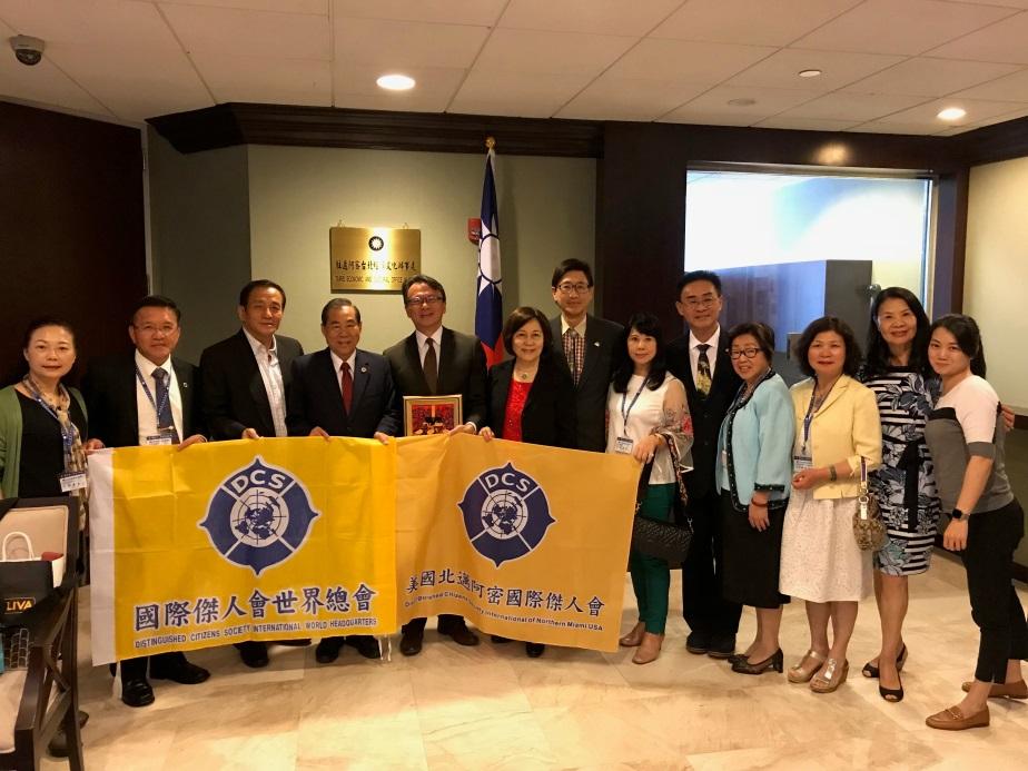 國際傑人會世界總會傅忠雄總會長於6月13日率世界總會副總會長吳毓苹、加拿大總會長鄭秀明及前美國總會長吳睦野等人拜會本處,傅忠雄總會長表示此行係為主持北邁阿密傑人會及南邁阿密傑人會成立大會,特別自臺灣前來,並強調該會為社會公益團體,以闡揚民主自由理念,發揮中華傳統文化為宗旨,著重協助他人成長及鼓勵回饋社會,盼能喚醒每個人心中善良面,以促進社會繁榮及祥和。錢處長感謝傅總會長及該會代表來訪,並對該會長期熱心公益,支持中華民國,愛護臺灣表示感佩。