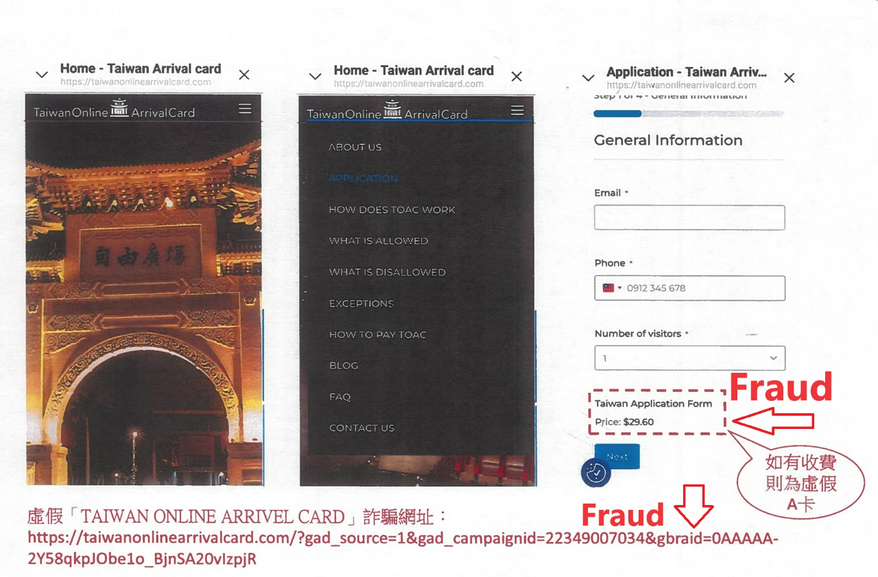 Due to recent incidents where some travelers to Taiwan submitted mistakenly their entry information on fraudulent websites(as shown in the attachment), resulting in personal data breaches and financial losses, please be advised that the Taiwan Arrival Card(TWAC) is free of charge and can only be applied for through the official website of National Immigration Agency, ROC(Taiwan):https://twac.immigration.gov.tw.