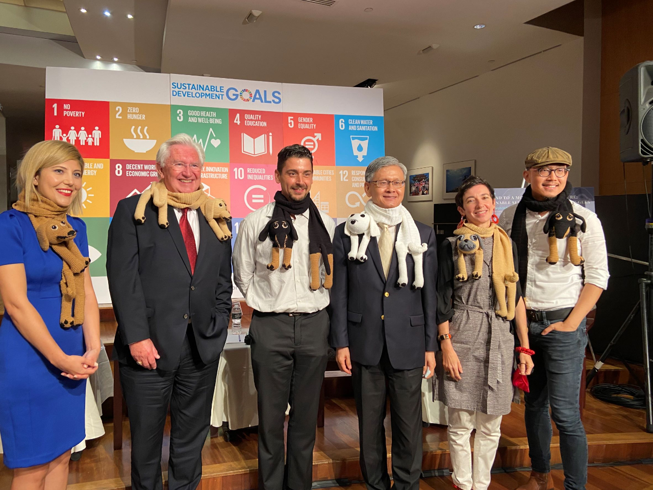 圖二:李大使及與會講者等穿戴由敘利亞婦女手工編織之可愛動物圍巾合影。