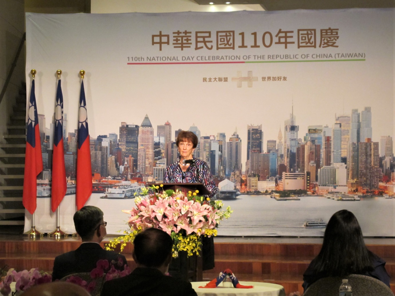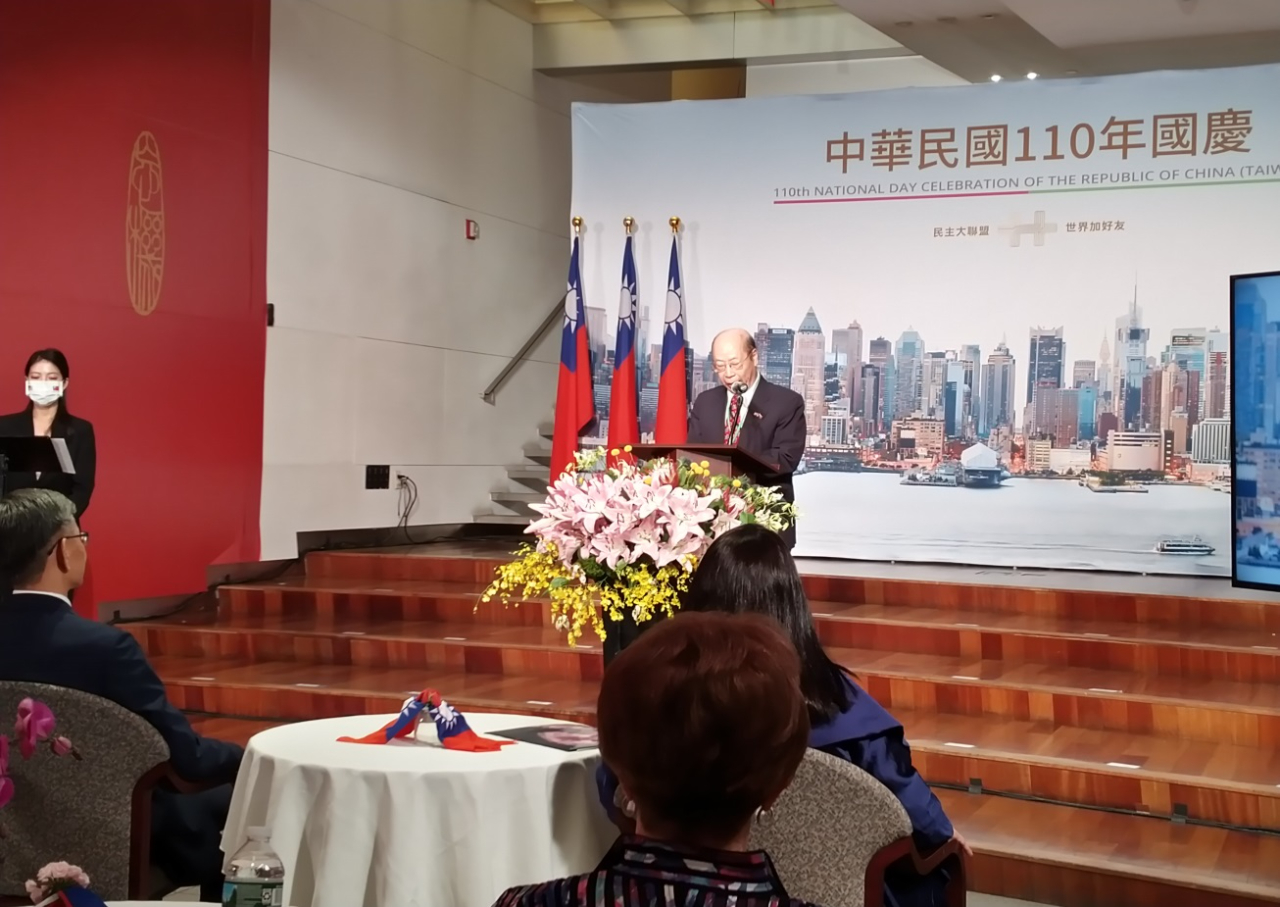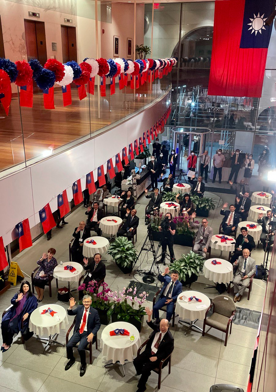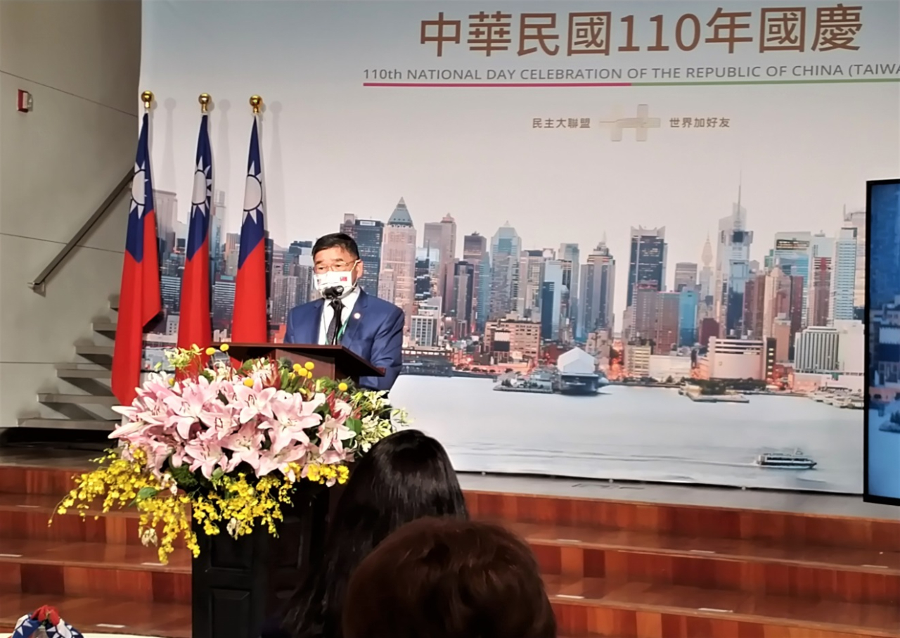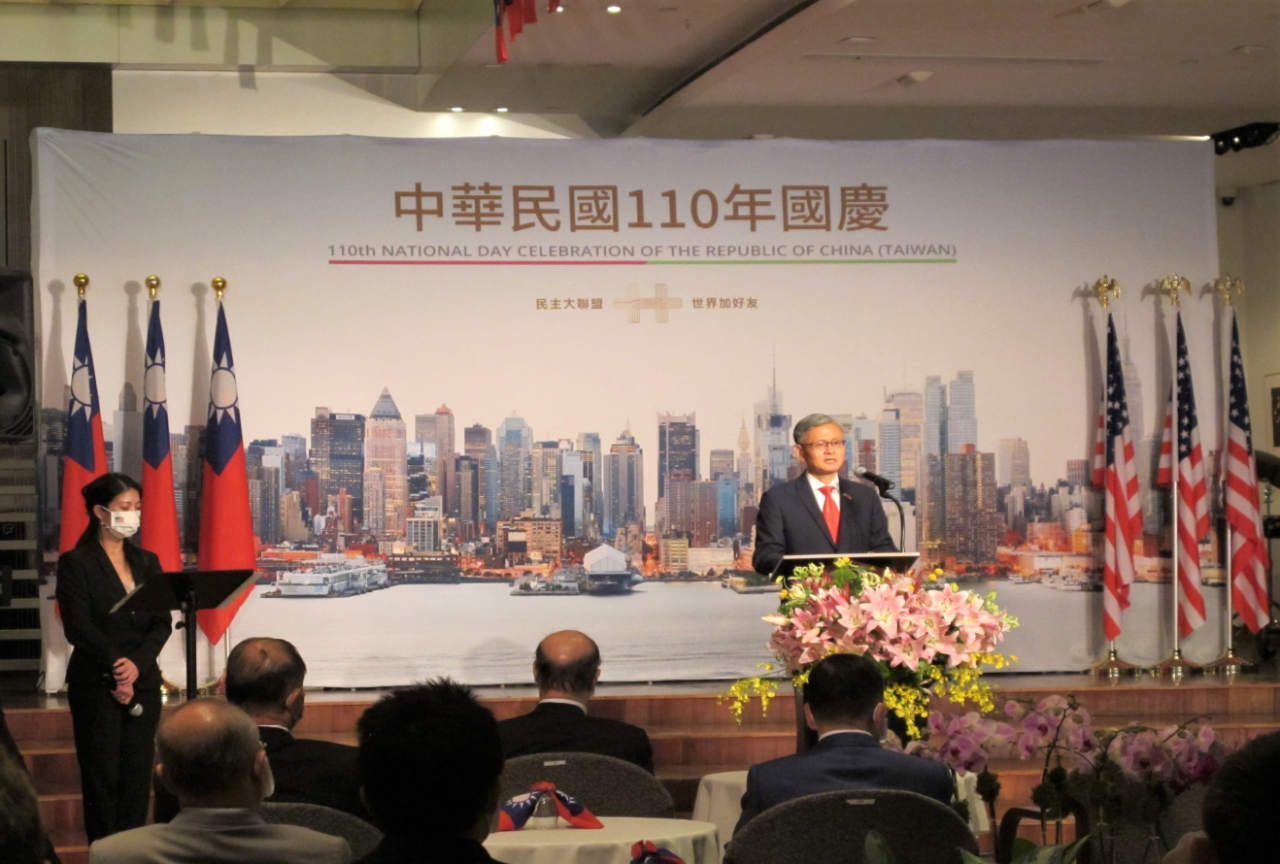 駐紐約臺北經濟文化辦事處今(7)日在經文處舉辦中華民國110年國慶酒會,並同步線上直播,與各界同慶。為配合防疫,今年許多政要選擇以錄製影片及致贈賀狀、賀詞方式祝賀;除實體酒會現場30位各界代表嘉賓外,另吸引眾多政、學、僑界人士線上熱烈參與。