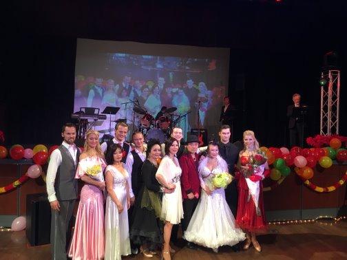 第三屆「月來香慈善晚會」藝術總監紐約立人學苑校長周興立(右4) 、時裝設計師李蘇珊(右3)與國標舞示範表演的舞者合影。