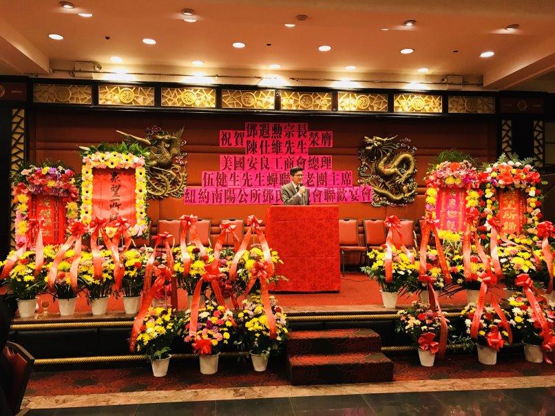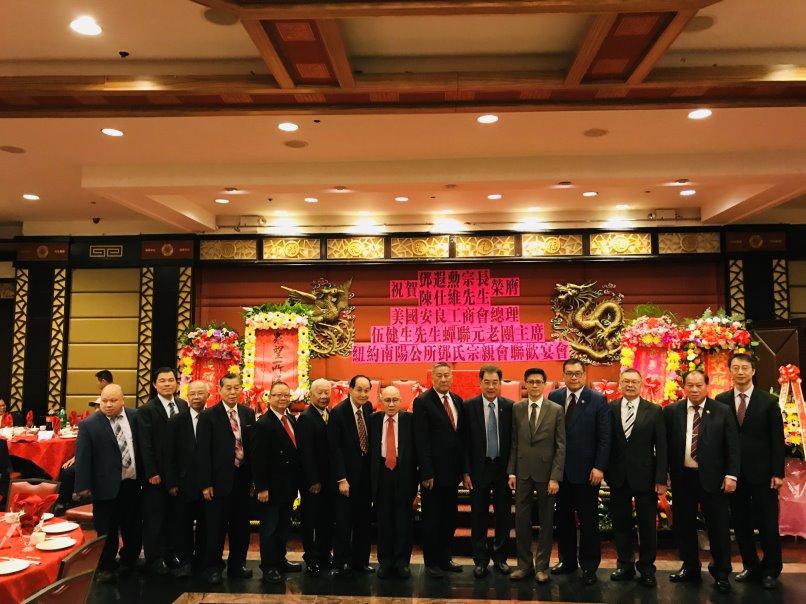 紐約南陽公所及鄧氏宗親會5月21日晚間於華埠金豐大酒樓舉行聯歡餐會,慶賀鄧遐勳宗長及陳仕維先生榮膺美國安良工商會總理及伍健生元老蟬聯元老團主席,駐紐約辦事處副處長楊光彬、組長張必強、紐約華僑文教服務中心主任黃正杰、副主任葉帝余、紐約中華公所主席兼美洲協勝公會總理伍銳賢、美東聯成公所主席黃達良、紐約臺山寧陽會館主席伍籍泮、美國洪門致公總堂總理李偉強等僑社僑領200多人與會,喜氣洋洋。