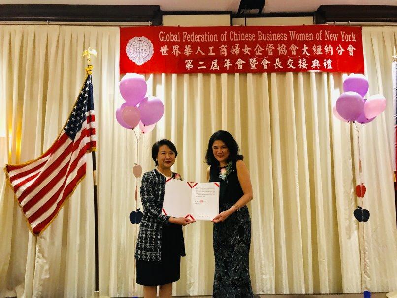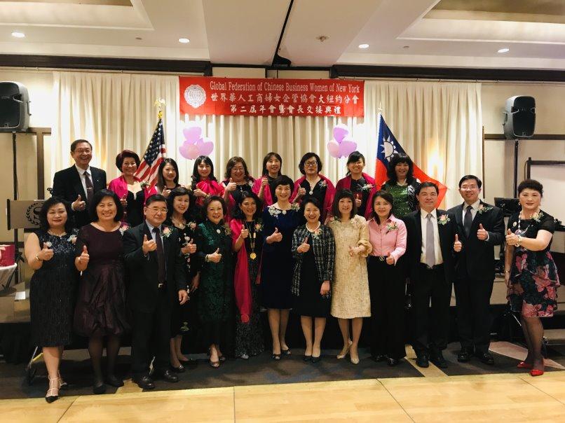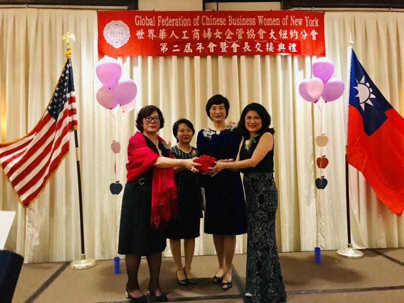 世界華人工商婦女企管協會大紐約分會4月26日晚間舉行年會暨會長交接典禮,在駐紐約辦事處大使徐儷文和協會總會長劉琍綺的監交下,新任會長葉周森娣宣誓就職;紐約華僑文教服務中心主任黃正杰、紐約市議員顧雅明及來自全球各地約200位協會會員出席同慶。