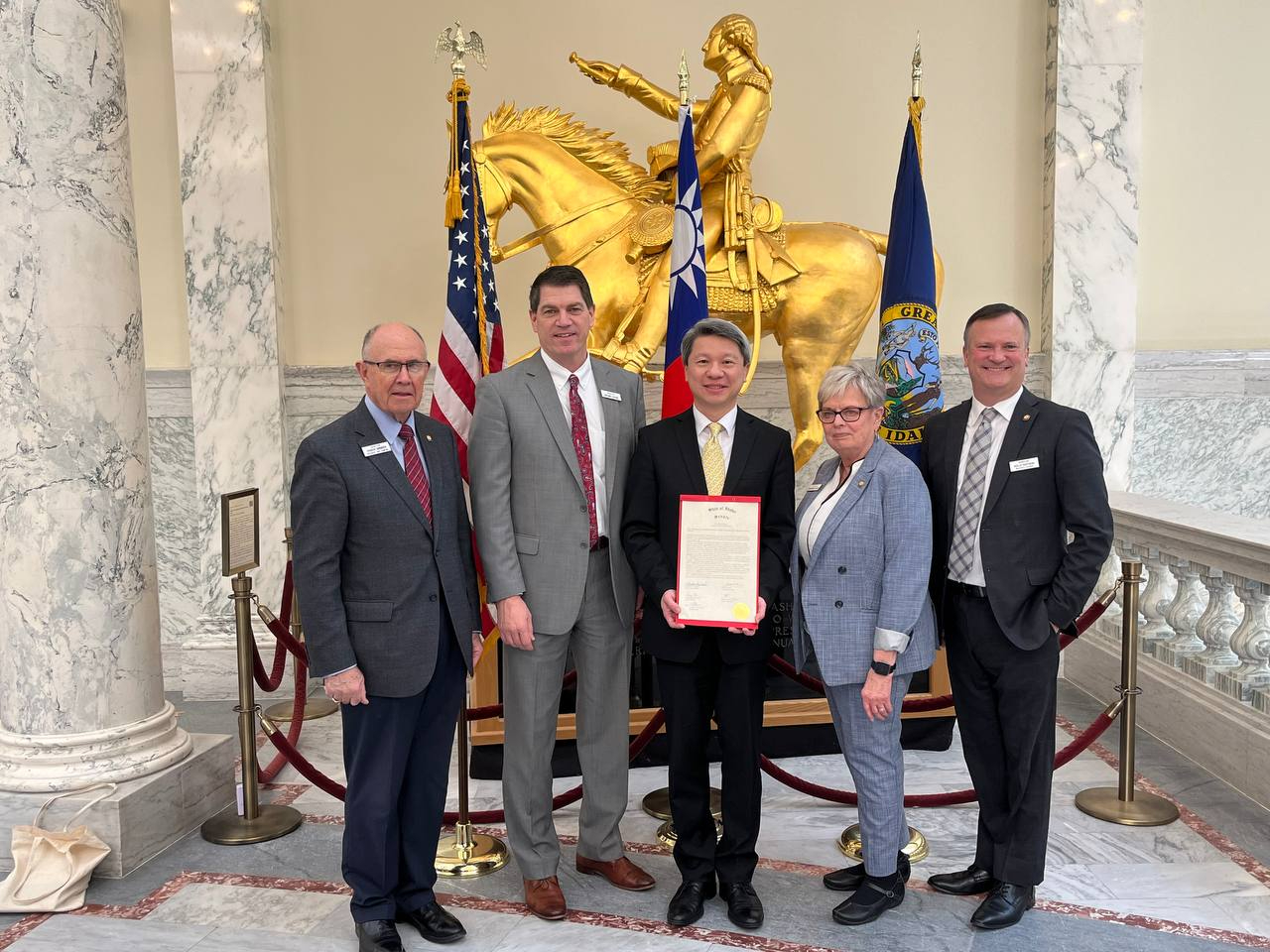 甄總領事承接參議會挺台文告,議會領袖包括參議會代議長Chuck Winder、商業暨人力資源委員會主席Kevin Cook、農業委員會主席Linda Hartgen及多數黨領袖Kelly Anthon(自左至右)均出席記者會支持,現場並懸掛我國國旗。