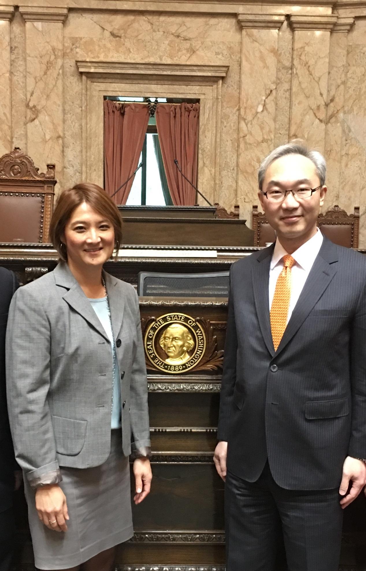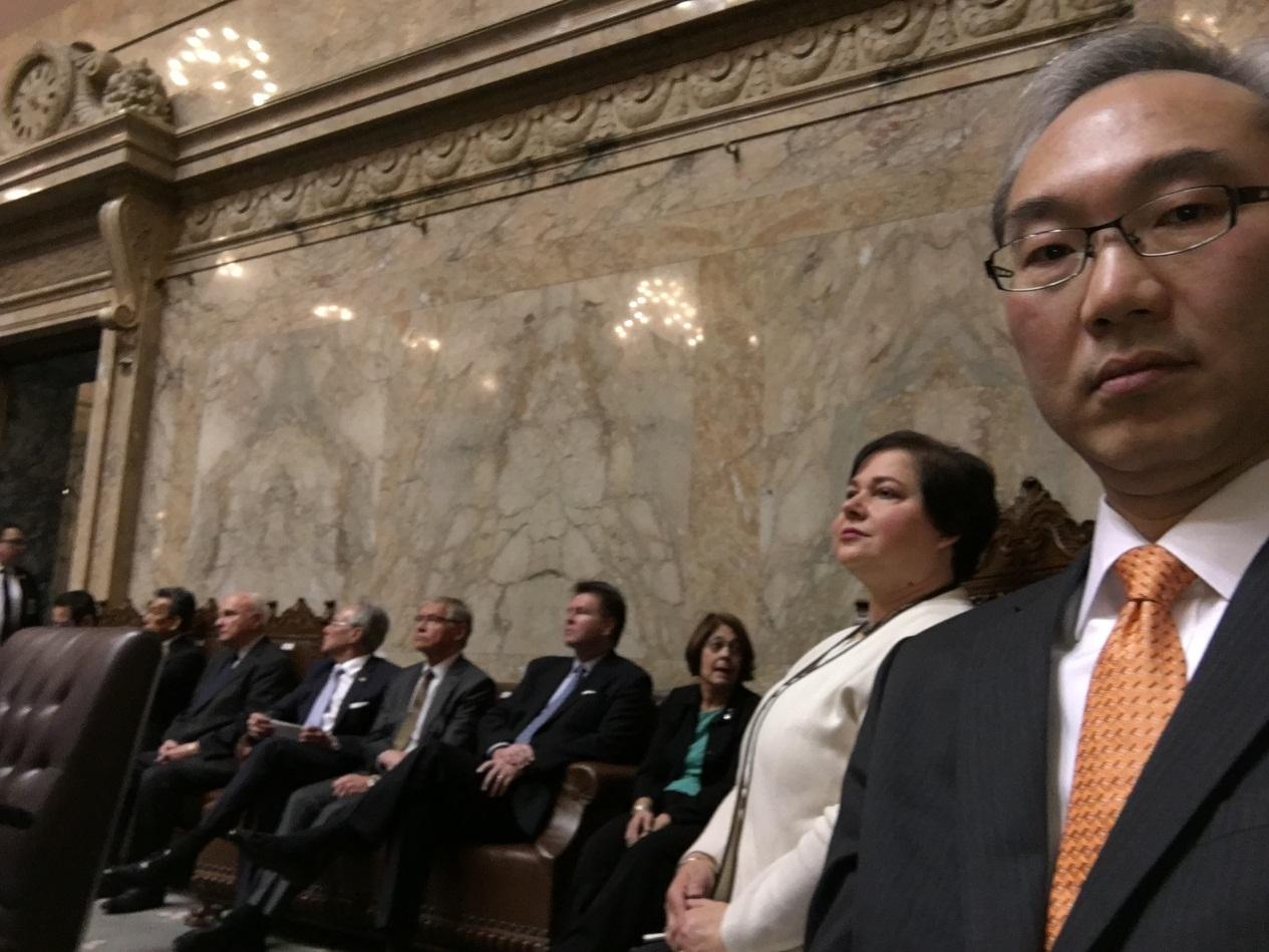 駐西雅圖辦事處姚金祥處長偕吳副處長鎮祺於106年1月11日上午赴華盛頓州首府Olympia,出席在華州眾議會議場舉行的華州州長Jay Inslee(連任)及副州長Cyrus Habib(新任)等州政府高層官員宣誓就職典禮,續聽取I州長對華州參眾兩會聯席會議發表州情咨文演說。姚處長與華州領事協會成員約20餘國總領事(或名譽領事)同坐於議場內,並獲逐一唱名介紹。姚處長於典禮結束後在會場接受美國西北區唯一華人電視台「全美電視台」專訪,並與若干華州參、眾議員親切互動。