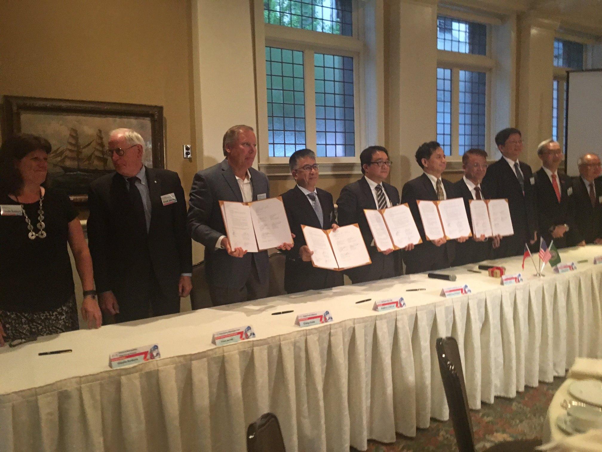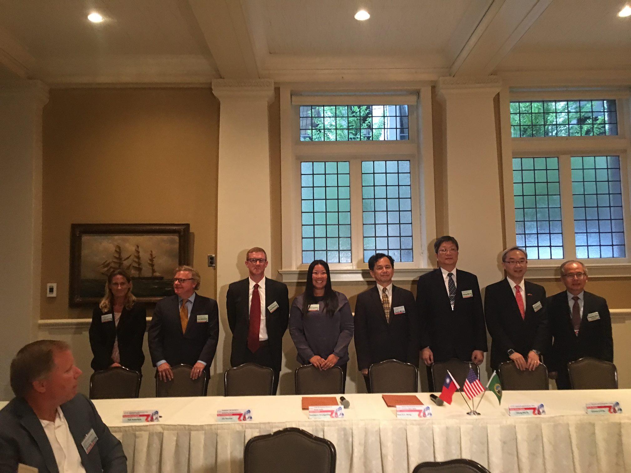 駐西雅圖辦事處姚金祥處長與經濟部工業局副局長游振偉8月28日假西雅圖The Rainier Club共同舉辦歡迎經濟部【深化台美產業合作連結訪美團】晚宴暨合作備忘錄簽署典禮,姚處長、游副局長與華盛頓州金郡資深副郡長Fred Jarrett、金郡郡議員Claudia Balducci、Snohomish郡郡議員Stephanie Wright、微軟公司副總裁Tom Robertson、SSA International公司副總裁Joe Ritzman等人共同見證我經濟部台美產業合作推動辦公室與大西雅圖貿易發展聯盟(TDA)及與潔淨能源聯盟(CTA)分別簽署合作備忘錄,為未來台灣與華盛頓州的相關產業合作奠定更堅實的基礎。應邀與會的貴賓包括游副局長所率代表團乙行、大西雅圖貿易發展聯盟及潔淨能源聯盟的會長及理事會成員,以及在大西雅圖地區從事科技及航太產業的台商及商會會長等。