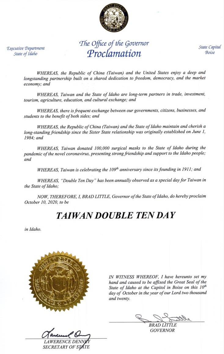 愛達荷州州長Brad Little頃頒發文告申賀本年國慶,宣布10月10日為「台灣雙十日」,肯定台愛雙邊交流密切、感謝台灣於此次疫情間援贈10萬片醫療口罩以及紀念台愛建立姊妹關係36週年等,駐西雅圖辦事處誠摯感謝,並將持續推昇台愛關係。