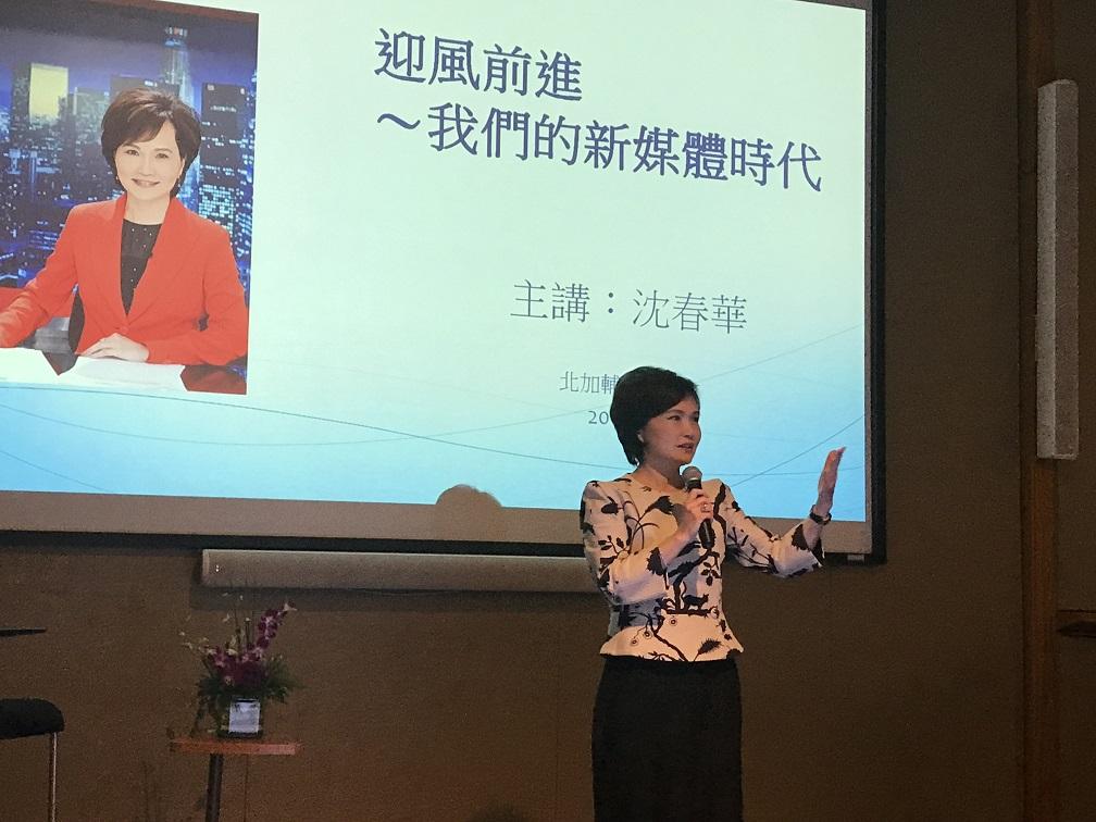 處長馬鍾麟致詞表示,沈主播大學時期就在主持節目,後來前往美國南加大深造媒體管理碩士,學成返臺即擔任主播,以嫻熟的採訪技巧、累積的實務經驗,加上自然溫和兼具深度的訪談風格,先後獲得13座金鐘獎,是電視金鐘獎最高紀錄得獎者。沈春華表示網絡新媒體是完全跨國界的,打破了傳統媒體的地域限制,達到「天涯若比鄰,遊子亦知天大事」。其影響層面也由傳統單向訊息傳遞轉型到可與觀眾雙向互動的型態,更成為候選人爭取支持者的重要工具,精闢的分析,獲得全場觀眾熱烈好評,爭相發言詢問對媒體未來發展、趨勢及如何提升臺灣媒體品質之看法與建議,活動在熱絡的氣氛中圓滿結束。