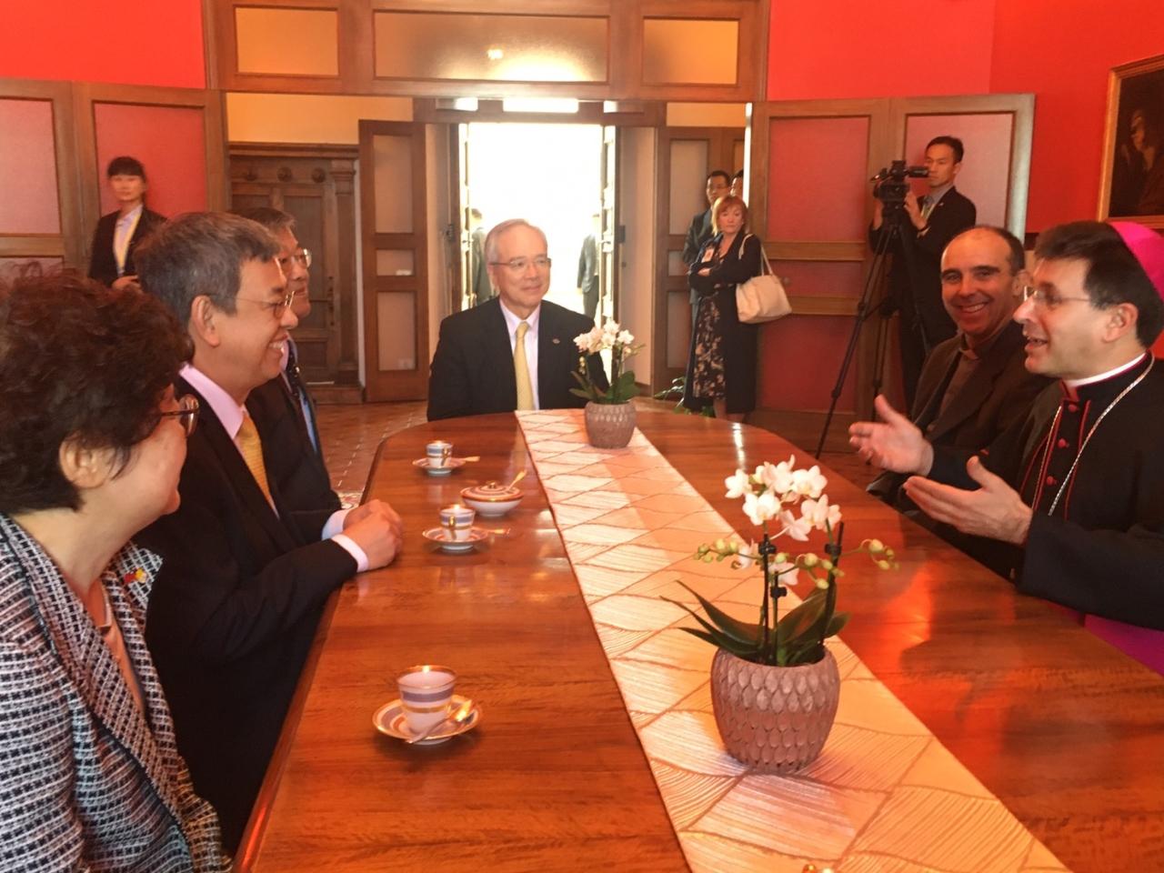 洛雷托總主教兼宗座代表達爾欽(Fabio Dal Cin)親自接待陳建仁夫婦。達爾欽表示,今年8月特別到台灣參訪苗栗洛雷托,不只驚奇發現跟義大利原版的完全相同,連牆上刻痕、奉獻箱都一致,他還受到當地信徒熱情款待芒果、鳳梨酥等特產,讓他覺得就像回到家一樣。