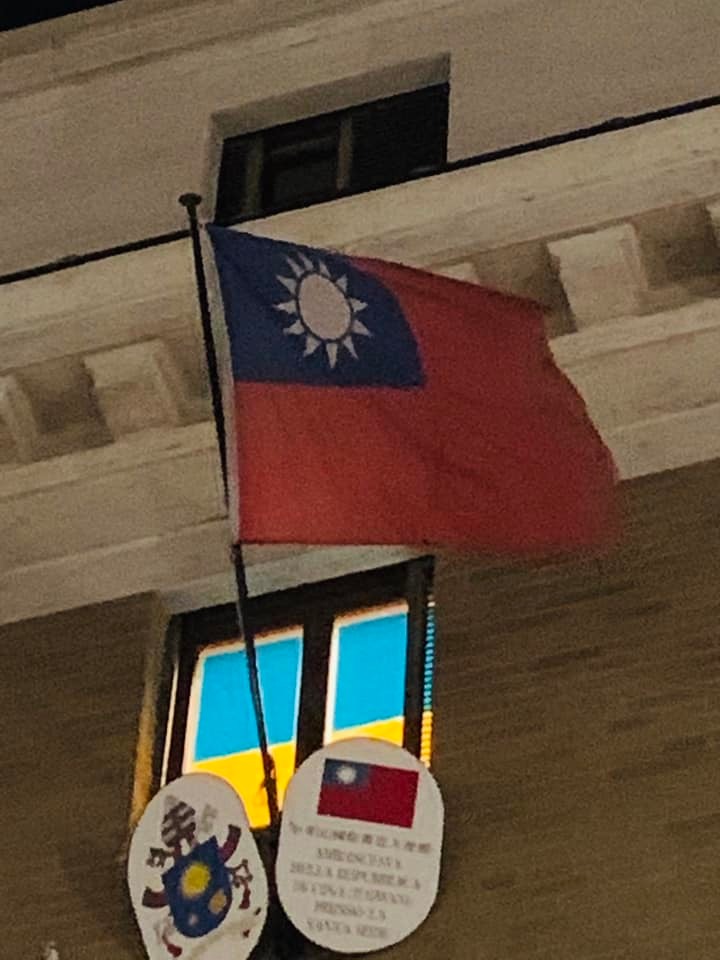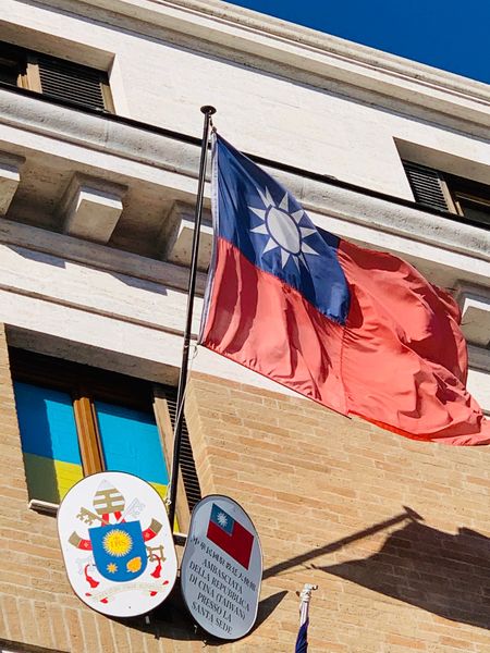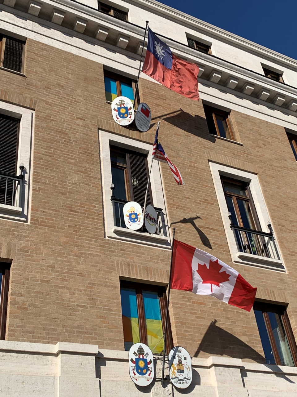為表達台灣與世界民主國家站在一起,共同支持烏克蘭對抗俄羅斯侵略的立場,駐教廷大使館日前特別將對外玻璃窗貼上烏克蘭國旗的藍黃色彩,引起許多路過朝聖客、遊客拍照致意。