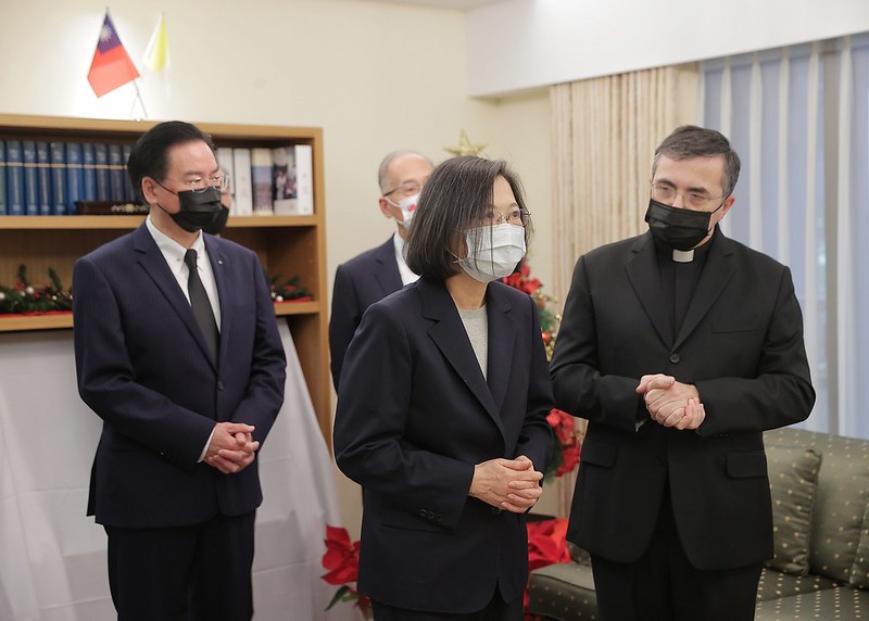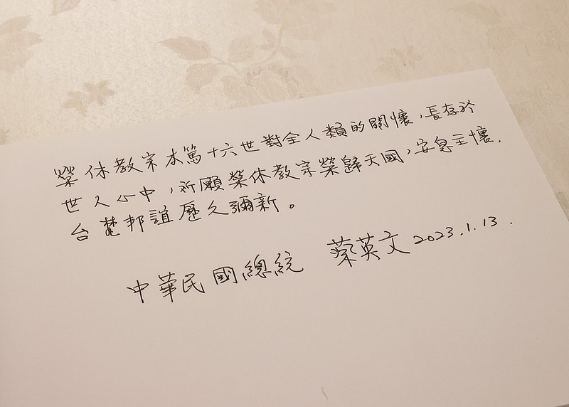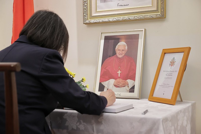蔡英文總統於1月13日下午前往教廷駐臺大使館向榮休教宗本篤十六世(Pope Emeritus Benedict XVI )致哀。