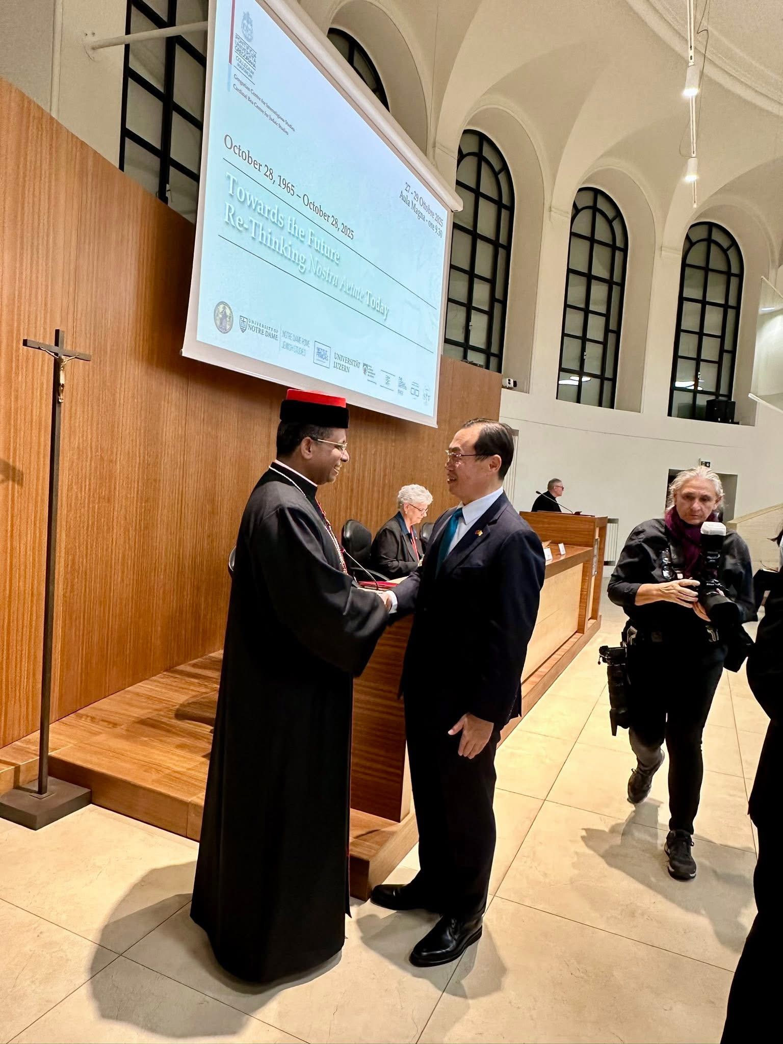 教廷跨宗教對話部Card. George Jacob Koovakad樞機主教致詞時強調,本次會議將持續發揚宣言的核心宗旨,展現不同信仰間透過交流與對話所建立的奉獻(devotion)、信任(trust)及兄弟情誼(fraternity)之精神,為世界促進團結、愛與和平。賀大使在會議開始前也向教廷跨宗教對話部部長Card. George Jacob Koovakad樞機主教問候致意。
