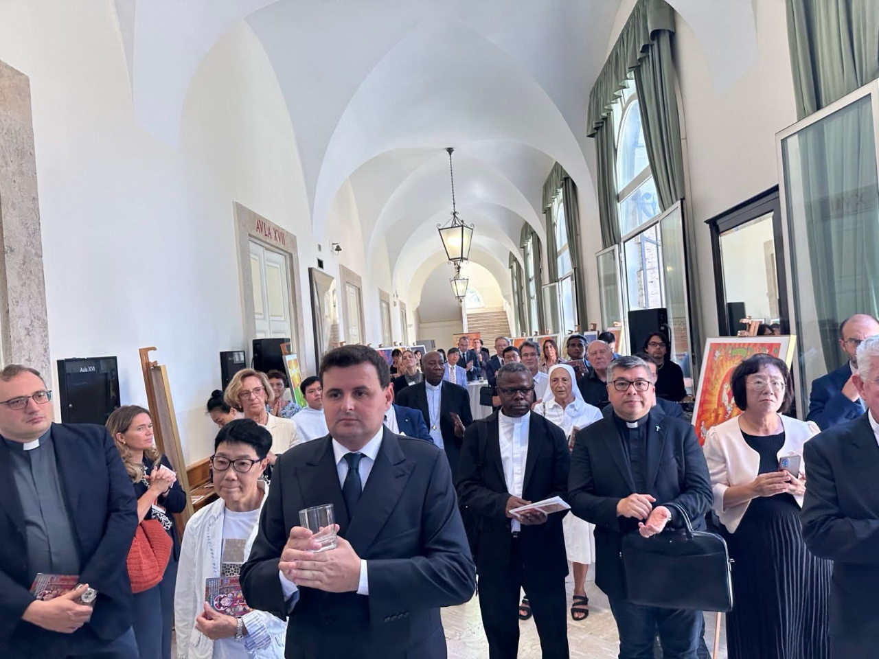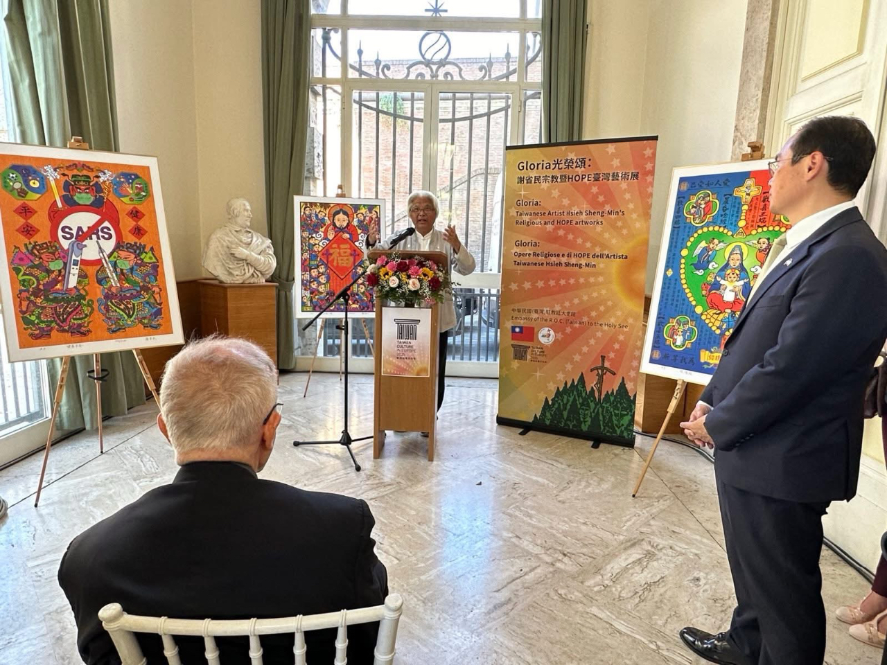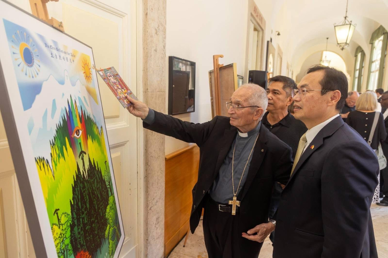 本館賀大使於9月18日在「宗座傳信大學」(Pontificia Università Urbaniana, PUU)與台灣亞洲大學謝省民教授共同主持「Gloria光榮頌:謝省民宗教暨台灣藝術展」開幕酒會,這次展出是透過台灣知名藝術家謝省民教授結合天主教信仰及台灣傳統文化的創作,向教宗良十四世(Pope Leo XIV)帶來台灣的祝福,並且希望以藝術為橋樑,為人們創造彼此理解的美好相遇。