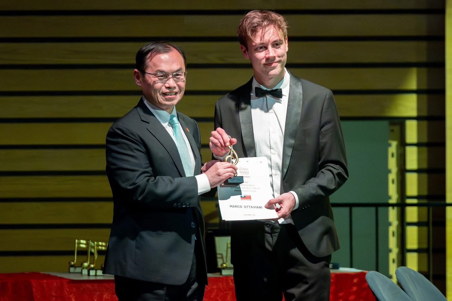 典禮主持人「柯德莉文化基金會」(Fondazione Marcella Crudeli)主席PAOLO MASOTTI在賀大使頒獎時,特別請在場觀眾一起感謝台灣對羅馬國際鋼琴大賽的長年支持,獲得全場熱烈迴響。本年「台灣獎」得主為義大利籍青年鋼琴家Marco Ottaviani,他同時也是本年「第34屆羅馬國際鋼琴大賽」的首獎得主,個人囊括7大獎項,成績傲人。