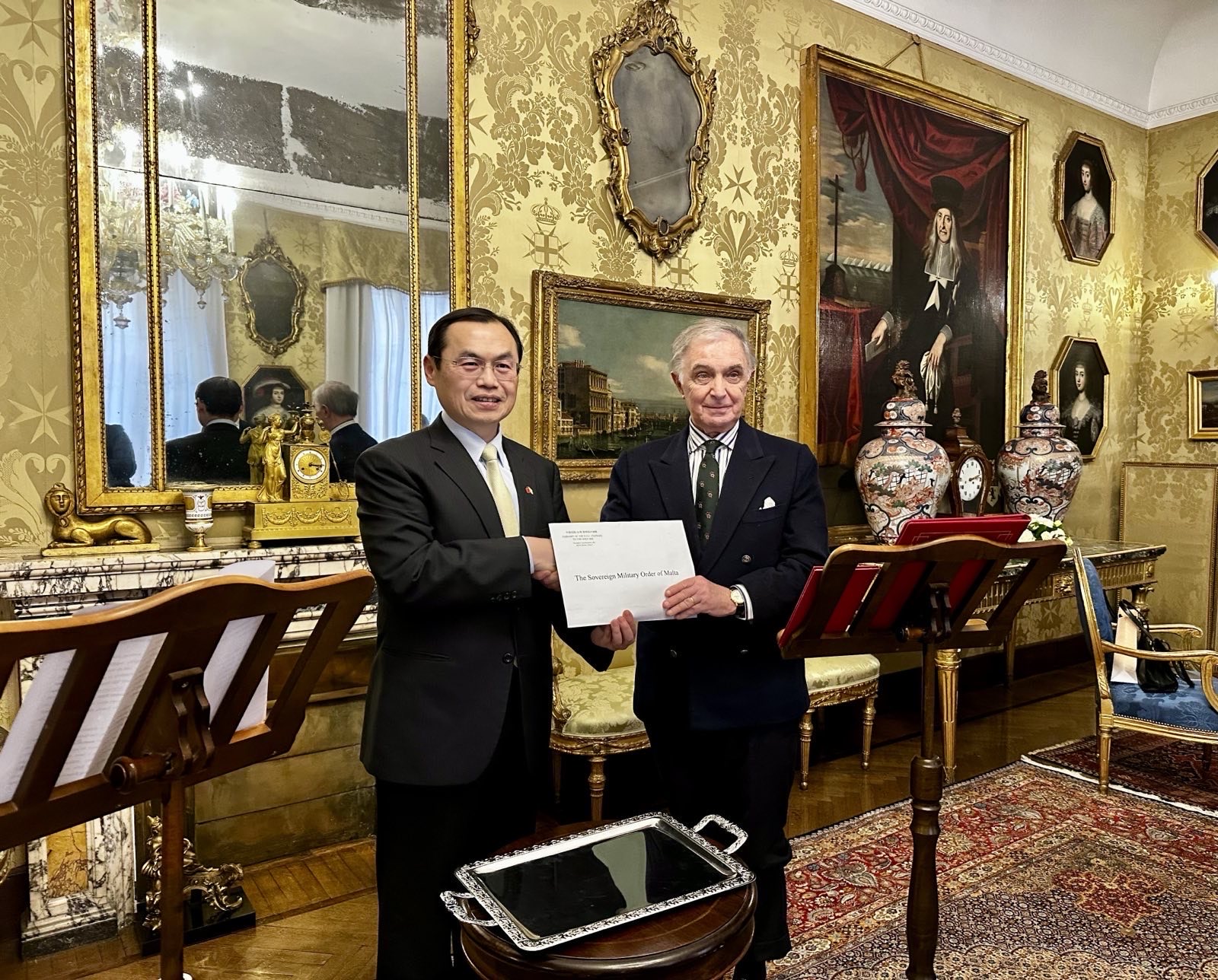 本館賀大使忠義偕郭秘書倢妤於2026年1月26日赴馬爾他騎士團總部,代表台灣政府捐贈贊助款予馬團在伯利恆(Bethlehem)推動之「聖家醫院濟貧計畫」(Holy Family Hospital Poverty Alleviation),馬團總理兼外交部長(Grand Chancellor) Riccardo Paternò di Montecupo代表受贈,馬團外交事務秘書長(Secretary General for Foreign Affairs) Amb. Giampaolo Cantini、馬團衛生部長室幕僚長(Chief of Cabinet of the Grand Hospitaller)Mr. Ivo Graziani及外交部主管亞洲事務官員Ms. Domitilla Romanini等在場觀禮。