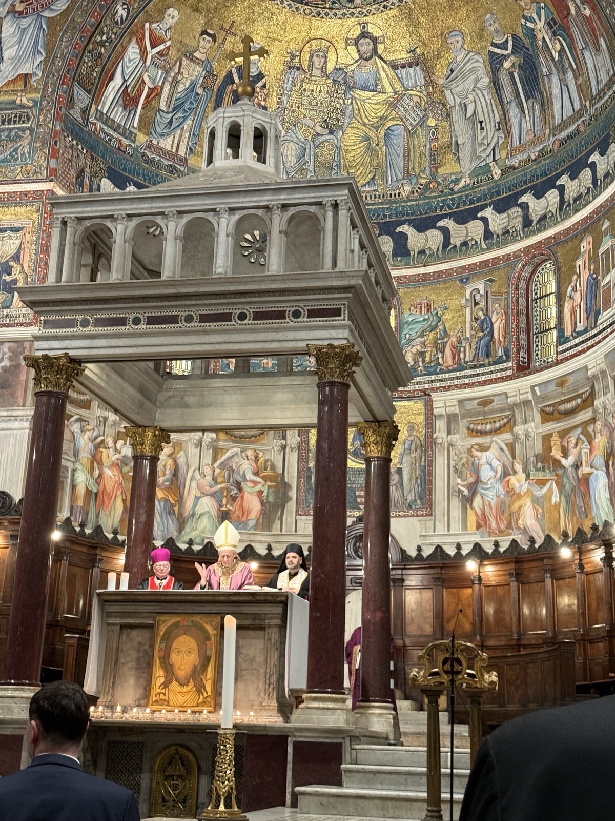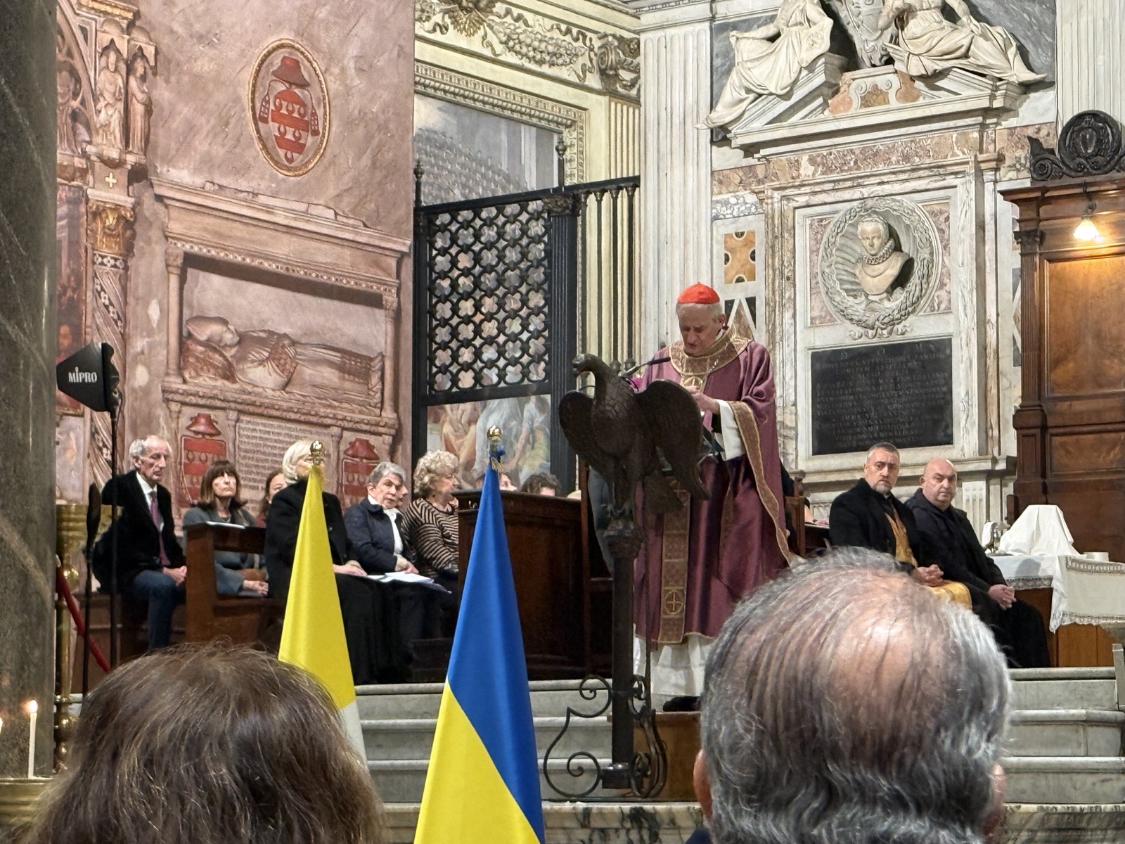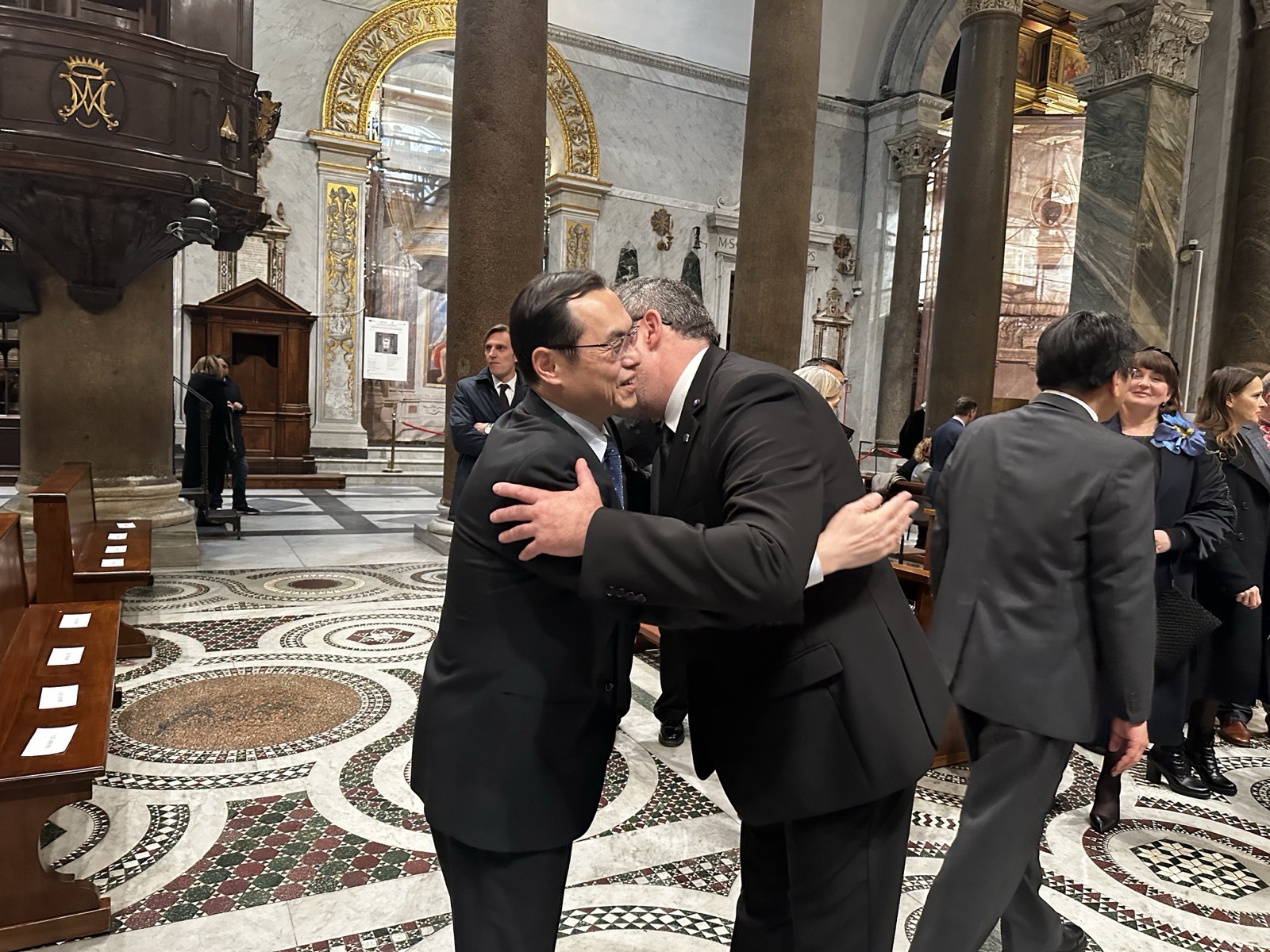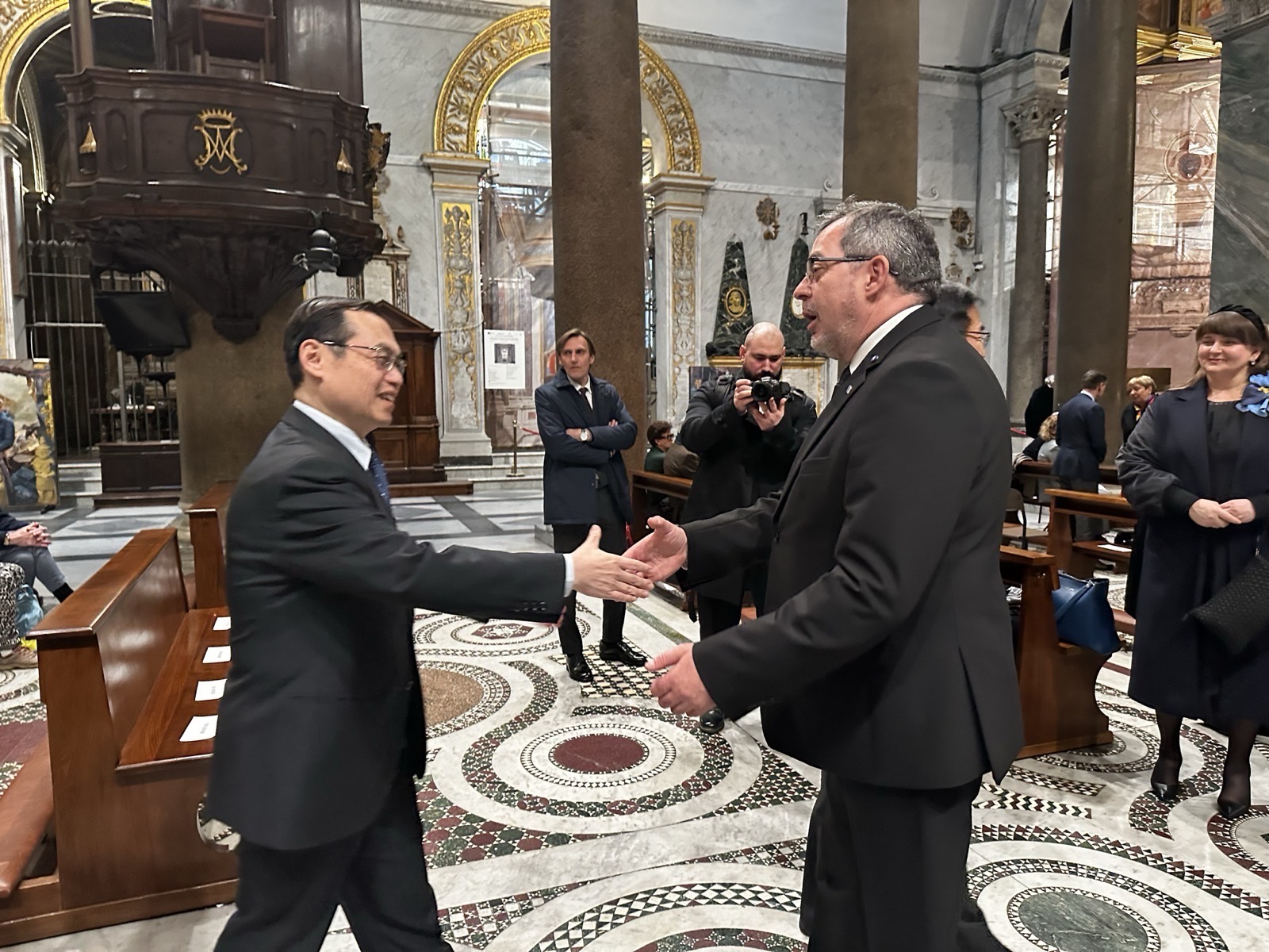 本館賀大使忠義於本(2)月25日赴「特拉斯特維雷聖母大教堂」(Basilica of Santa Maria in Trastevere),出席由教宗俄烏和平特使Card. Matteo Maria Zuppi樞機主教為紀念俄烏戰爭4週年主禮之「紀念烏克蘭受難者暨祈求和平彌撒」(Suffrage Mass for the Victims and to Implore Peace in Ukraine)。彌撒開始前,賀大使特別與烏克蘭駐教廷大使H.E. Amb. Andrii Yurash擁抱致意,再度表達台灣對烏克蘭的支持與關懷。